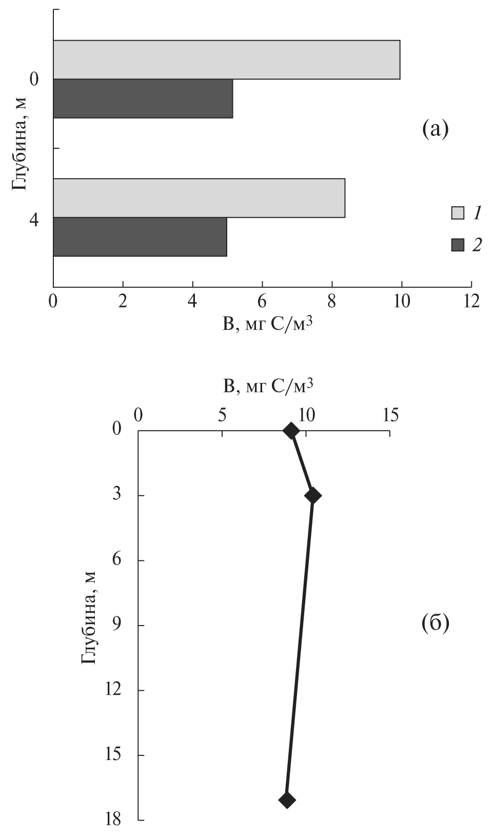 Рис. 3. Вертикальное распределение биомассы фитопланктона (B, мгС/м3) в градиентной зоне у входа в Кемскую Салму (а) на малой (1) и полной (2) воде в 2008 г. и в морской зоне на малой воде (б) в 2011 г.