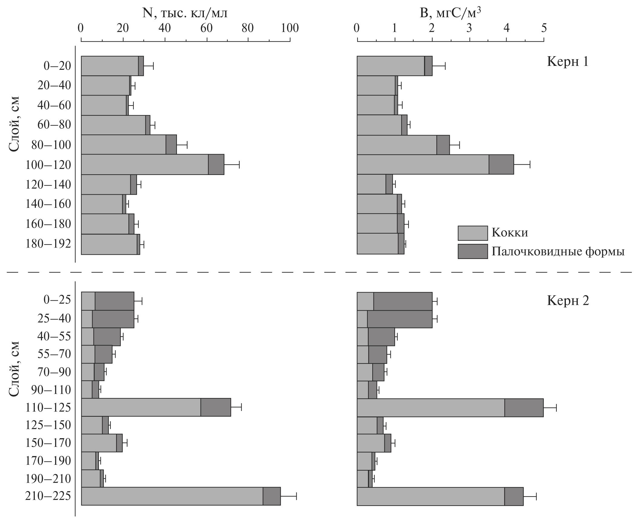 Исследуемые керны двухлетнего льда характеризовались неравномерным вертикальным распределением численности бактерий (рисунок). Ее величина варьировала в пределах 21–68±3.2×103 клеток/мл (керн 1) и от 8±1.2×103 до 95±2.6×103 клеток/мл (керн 2). Таким образом, количество бактериальных клеток могло различаться в 12 раз между разными слоями льда. Среднее количество бактерий составляло 28±2.9×103 клеток/мл. Лед с максимальным содержанием бактерий в обоих кернах располагался на глубине от 110 до 125 см (промежуточные слои) и от 210 до 225 см (нижний слой керна 2): 68–72±6.2×103 клеток/мл и 95±7.7×103 клеток/мл соответственно. Максимальная концентрация растворенного органического углерода также была характерна для вышеупомянутых слоев с величинами от 1.3 до 1.4 мгC/л, тогда как средняя концентрация растворенного органического углерода в остальных слоях составляла 1.0 (Н. А. Беляев, персональное сообщение).