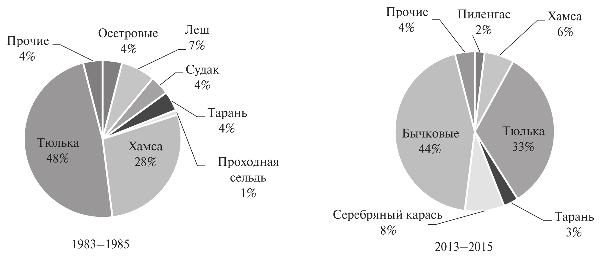 К настоящему времени изменилась не только величина вылова (например, в 1983–1985 гг. добывалось 32–42 тыс. т рыбы против 9–11 в настоящее время — табл. 1), но и его качественный (видовой) состав (рис. 1). Если в 1980-х гг. кроме тюльки Clupionella cultriventris и хамсы Engraulis encrasicolus значимыми были уловы осетровых Acipenseridae, леща Abramis brama, судака Sander lucioperca и тарани Rutilus rutilus, то в настоящее время доминируют бычки Gobiidae и ранее неизвестные в Азовском море вселенцы — серебряный карась Carassius gibelio и пиленгас Planilizahaematocheila [7].