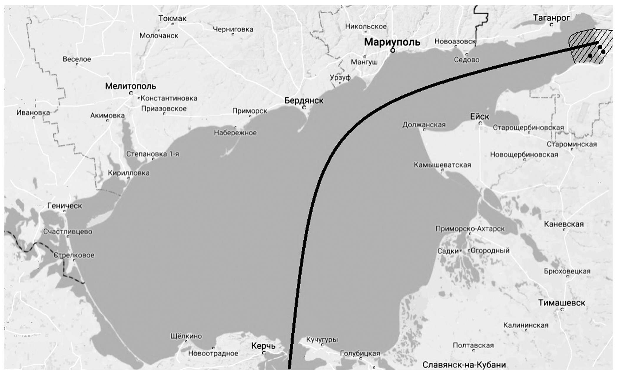 Рис. 2. Карта-схема района исследований: линия — разрез «дельта Дона — Керченский пролив», заштрихованная зона — район ихтиологического мониторинга, точки — расположение гидрометеопостов.