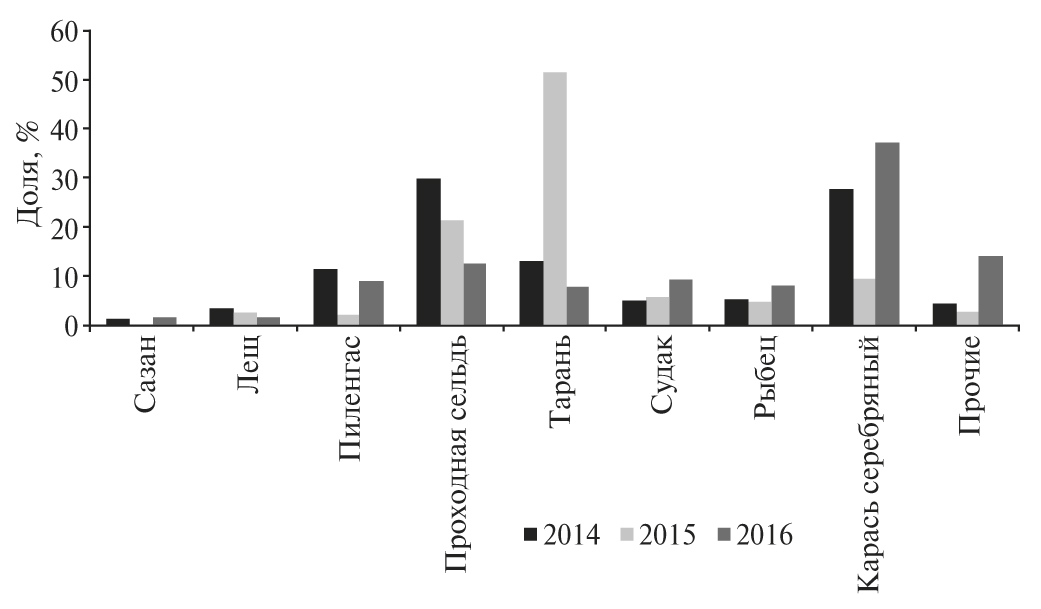 Рис. 3. Доля (% массы уловов) разных видов рыб в уловах в районе исследований в 2014–2016 гг.