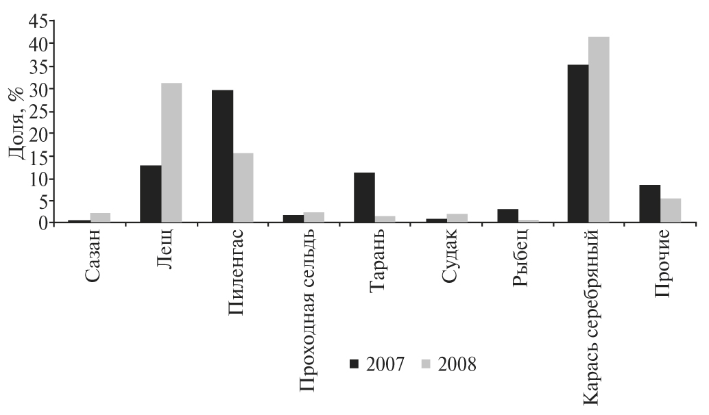 Для сравнения на рис. 4 приведены данные о составе уловов в 2007–2008 гг. [14]. По сравнению с этим периодом возросла доля в уловах сельди Alosa immaculata, сазана Cyprinus carpio и судака, уменьшилась — серебряного карася, леща, пиленгаса. Уменьшение уловов перечисленных видов связывают с излишней промысловой нагрузкой [15, 16, 12].
