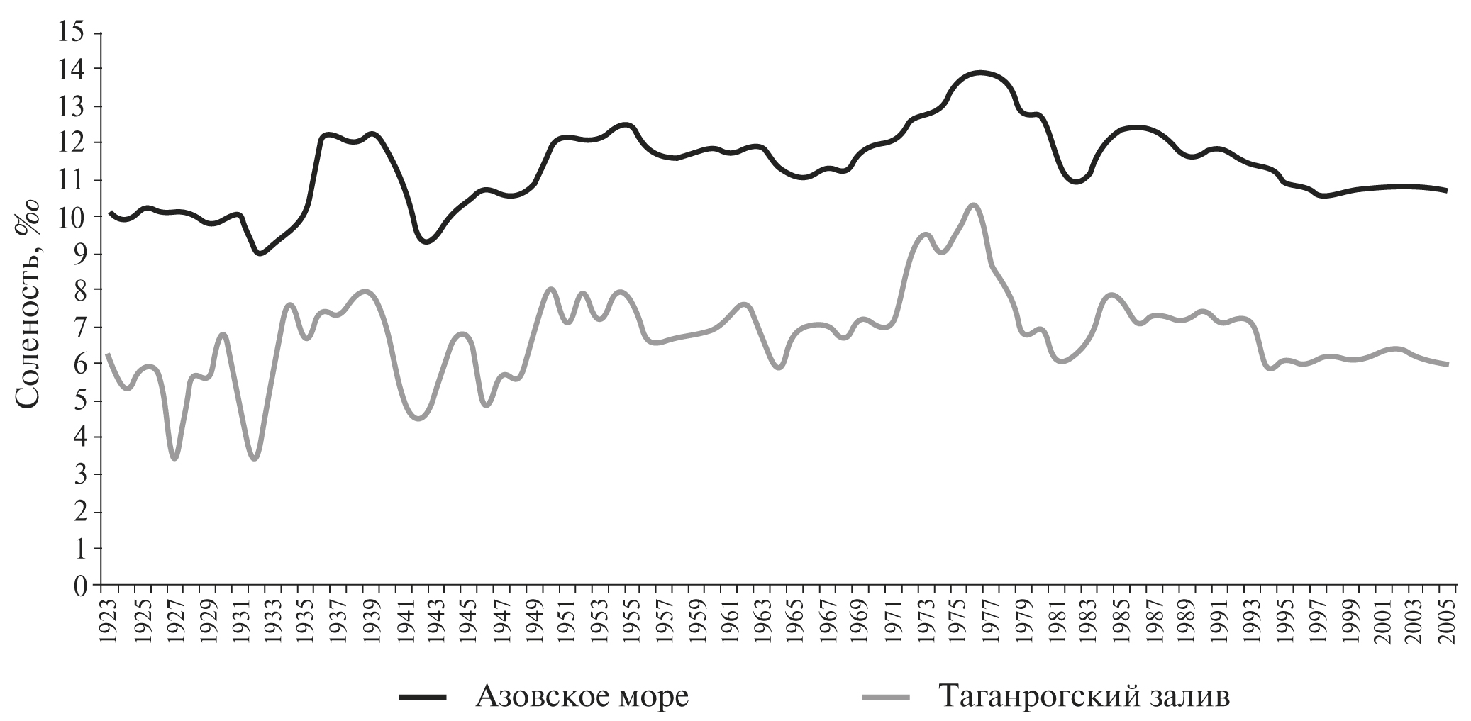Рост изъятия пресных вод для хозяйственных целей обусловил значительное сокращение пресного стока в море и возрастание поступления черноморских вод. В результате, с 1967 г. наблюдалось увеличение солености моря, и к концу 1970-х гг. ее значения достигали 15–18‰ в южных районах и 7–10‰ — в северо-восточных, в среднем для моря составляя около 13.8‰, что привело к росту вертикальных градиентов солености и плотности воды, ухудшило условия аэрации в придонных горизонтах. В последующие годы (1978–1982) наблюдалось преимущественно климатообусловленное увеличение увлажненности бассейна Азовского моря, что привело к понижению солености Азовского моря до 10.9‰ [4] (рис. 5).