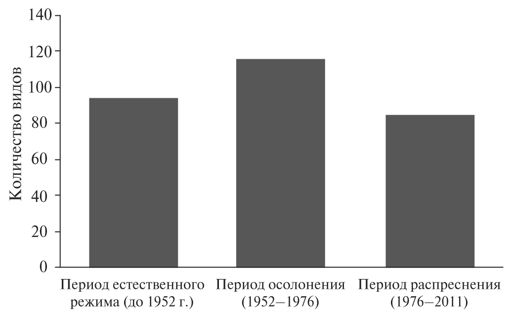 В период распреснения Азовского моря наблюдалось сокращение разнообразия его ихтиофауны по сравнению с периодом осолонения 70-х годов XX века. При естественном режиме Азовского моря ихтиофауна водоема насчитывала 94 вида, затем, в период повышения солености, видовое разнообразие увеличилось за счет черноморских иммигрантов до 115 видов (рис. 6). В этот район заходили, помимо традиционных сезонных вселенцев (хамсы, саргана Belone belone, черноморских кефалей, атерины Atherina boyeri, мерланга Merlangius merlangus, смариды Spicara maena и др.), и такие, которые отмечались крайне редко либо ранее данных об их присутствии в море вообще не было. К первым относятся луфарь Pomatomus saltatrix, черноморский калкан Scophthalmus maeoticus, скат-хвостокол Dasyatis pastinaca, катран Squalus acanthias, темный горбыль Sciaena umbra, светлый горбыль Umbrina cirrosa, черноморская кумжа Salmo trutta labrax, скумбрия Scomber scombrus, глазчатый губан Symphodus ocellatus, морская собачка Звонимира Parablennius zvonimiri, атлантическая атерина Atherina hepsetus и др. Эти факты свидетельствуют, что ихтиофауна Азовского моря в годы повышения солености его вод может значительно пополняться черноморскими иммигрантами, которые обитают в северо-восточной части Черного моря и могут переносить температуру воды менее +3...+5°C [14].