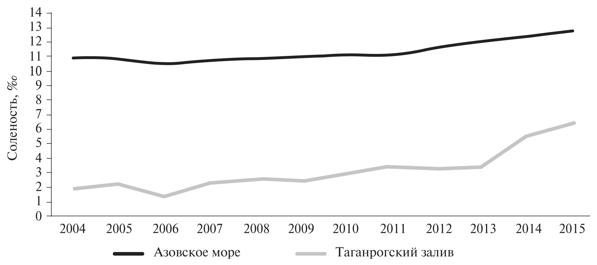 В период распреснения ихтиофауна сократилось до 84 видов, из которых 6 являются акклиматизантами или вселенцами [17]. Из них к значимым для рыболовства могут быть отнесены 25. Эти виды делятся на три группы: морские (хамса, тюлька, бычки, кефали, камбалы), проходные (осетровые, рыбец Vimba vimba, шемая Alburnus mento), полупроходные и пресноводные (судак, лещ, тарань, сазан, серебряный карась и др.). С 2009 г., по нашим данным, наблюдается очередное повышение солености. С 2009 по 2015 г. средний показатель для Азовского моря увеличился с 11 до 12.8‰ (рис. 7). Соответственно, увеличивалась и соленость Таганрогского залива. Средняя величина солености по Таганрогскому заливу в 2015 г. составила 6.4‰ и достигла максимального значения за весь период наблюдений с 2004 г. [18].