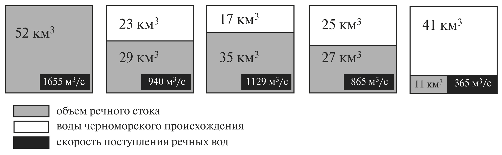 После зарегулирования Дона сброс воды в Азовское море объемом в 30 км3 является оптимальным. В последние годы речной сток уменьшился примерно в 3 раза (до 11 км3), его уменьшение возмещается затоком из Черного моря в Азовский бассейн соленой (до 17–18‰) воды объемом порядка 20 км3 (рис. 8) [19].