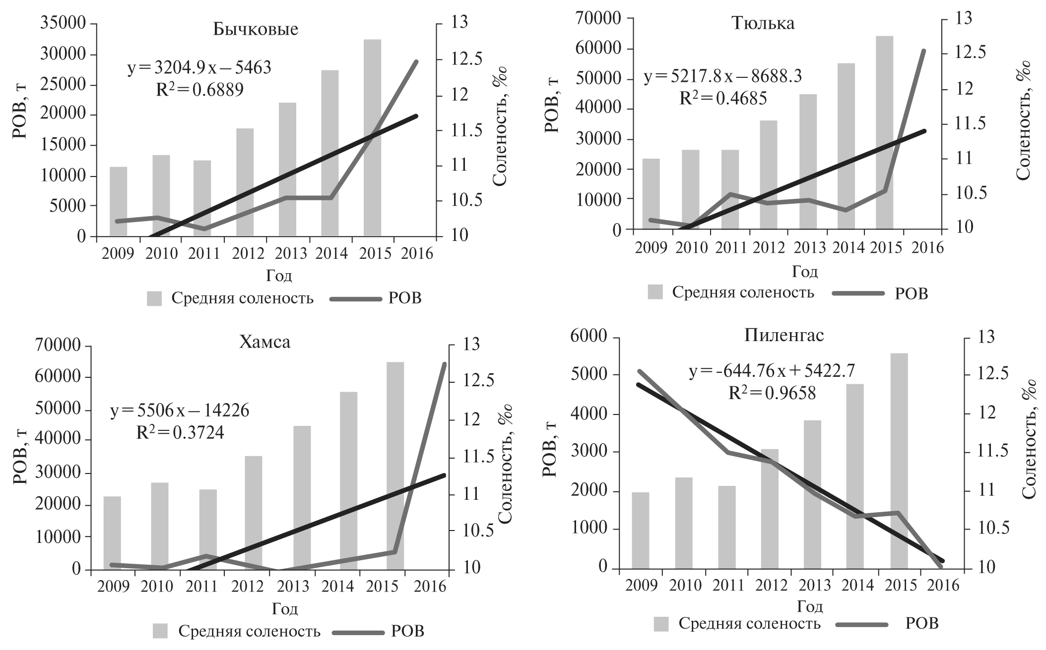 Как можно видеть, рекомендованный объем вылова (и, соответственно, запасы) морских рыб (за исключением акклиматизанта пиленгаса) в последние годы демонстрируют положительный тренд вместе с увеличением солености. Резкое снижение ресурсов пиленгаса вызвано большим масштабом незаконного промысла этой рыбы [12].