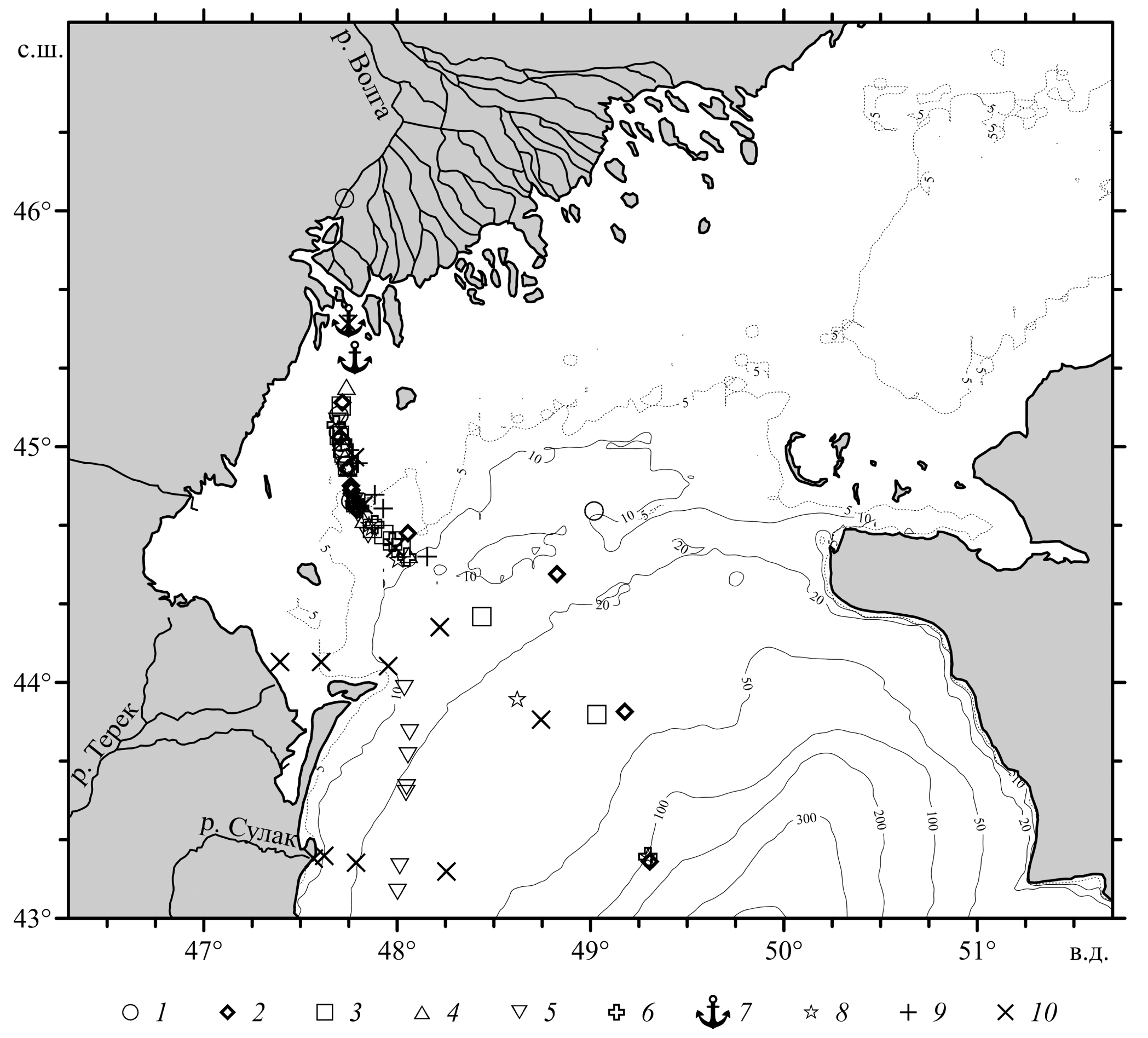 Исследование МФ р. Волги было начато нами в 2008 г. в рейсах НИС «Рифт (2008–2012 гг.) [1–4, 11] и «Никифор Шуреков» (2013–2015 гг.) и продолжается по настоящее время. Использованы материалы девяти экспедиций. Работы в области МФ проводились по единой программе и единой методике. В настоящей работе приводятся первые обобщенные данные по МФ Волги, полученные в 9 рейсах в разные сезоны года в течение 7 лет на акватории в пределах 42°45’–45°31’с. ш. и 45°19’–49°31’в. д. (рис. 1).