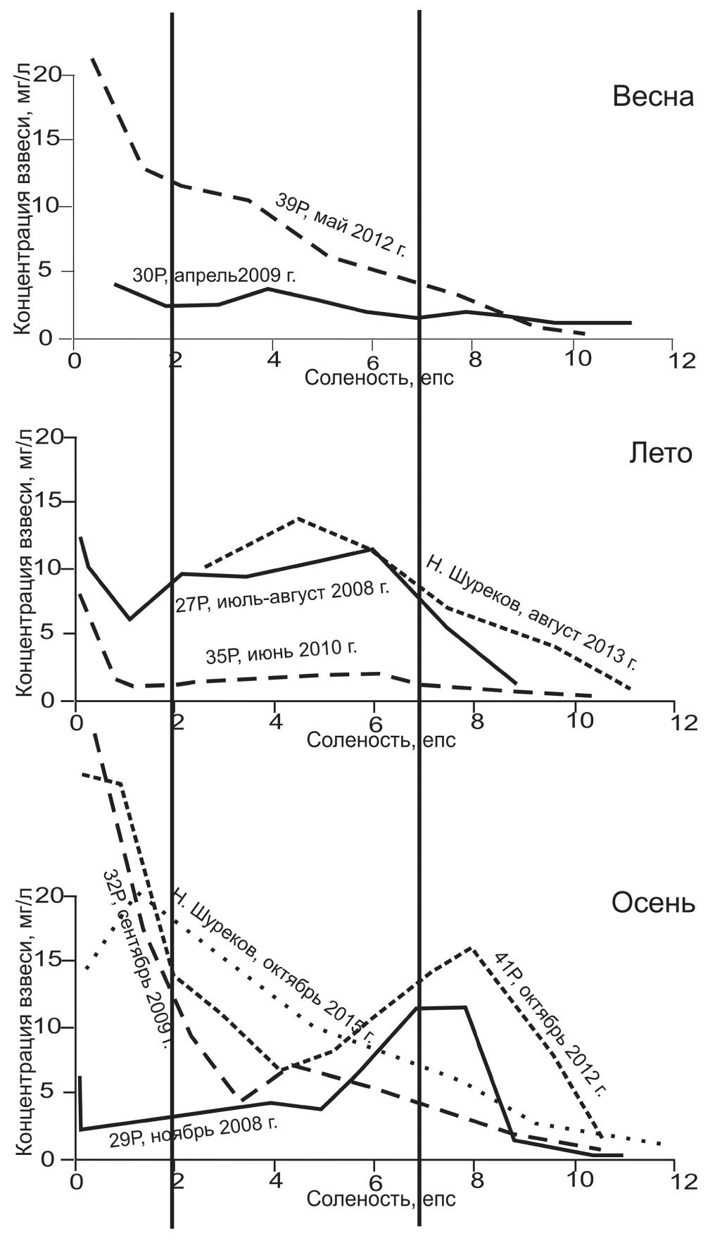 Рис. 2. Распределение концентраций взвеси в зависимости от солености в маргинальном фильтре р. Волги весной, летом и осенью в разные годы (вертикальные линии — деление МФ по этапам).