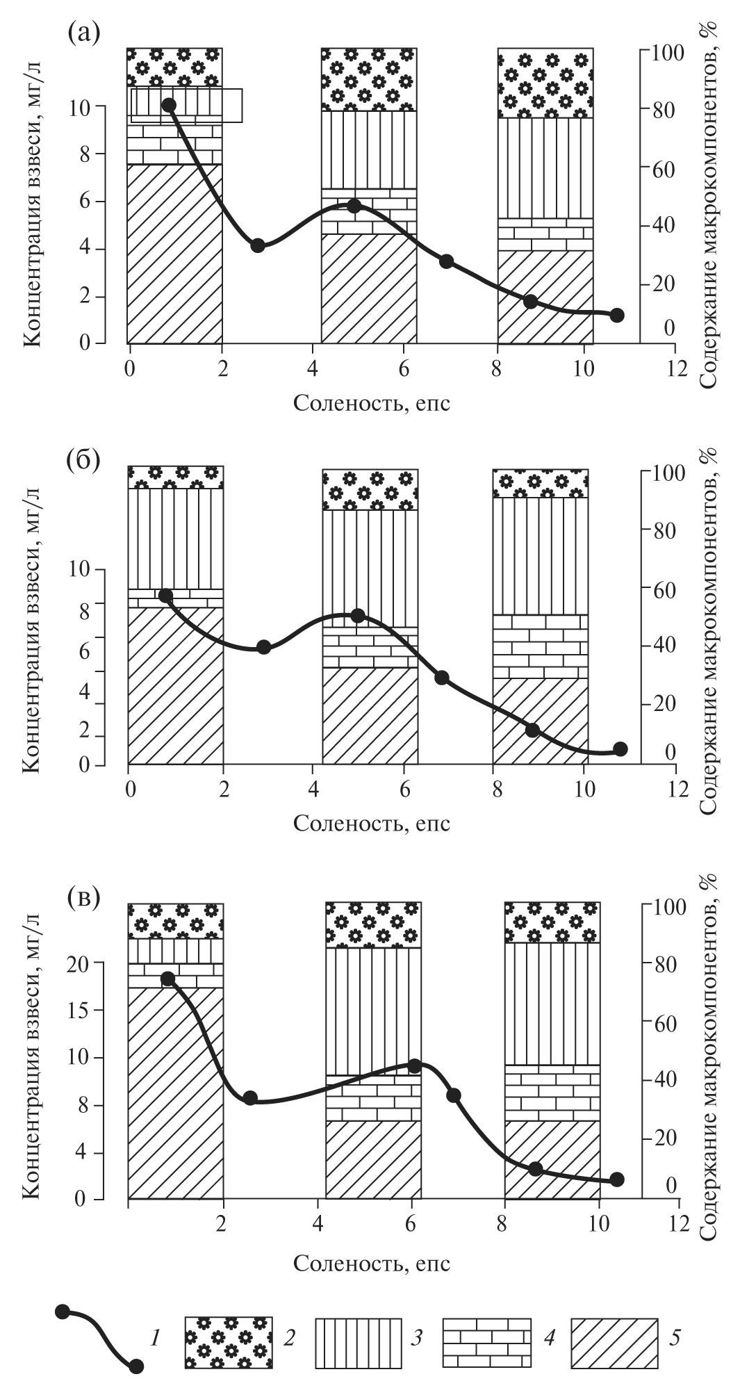 В пределах второго, коагуляционно-сорбционного, этапа с соленостью 2–7 епс концентрации взвеси продолжают уменьшаться, а при солености около 2.5 епс начинают увеличиваться за счет физико-химических процессов (коагуляции и флокуляции органических и металлорганических коллоидов) [5, 16–18, 20, 21 и др.]. Максимальные концентрации взвеси наблюдаются при солености 5.5–6 епс, а при увеличении солености они вновь уменьшаются. Здесь происходят основные процессы трансформации состава взвешенного вещества. Сезонные вариации концентраций на этом этапе менее выражены, чем на гравитационном.