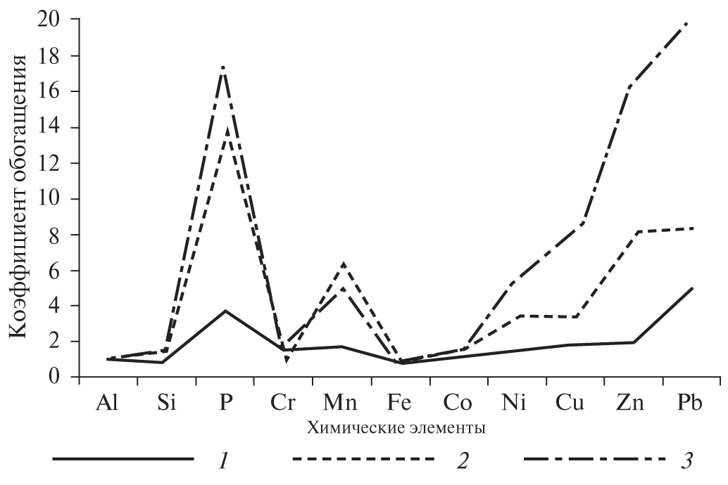 Рис. 4. Распределение коэффициентов обогащения химических элементов на разных этапах маргинального фильтра: 1 — гравитационный этап; 2 — коагуляционно-сорбционный этап; 3 — биологический этап.