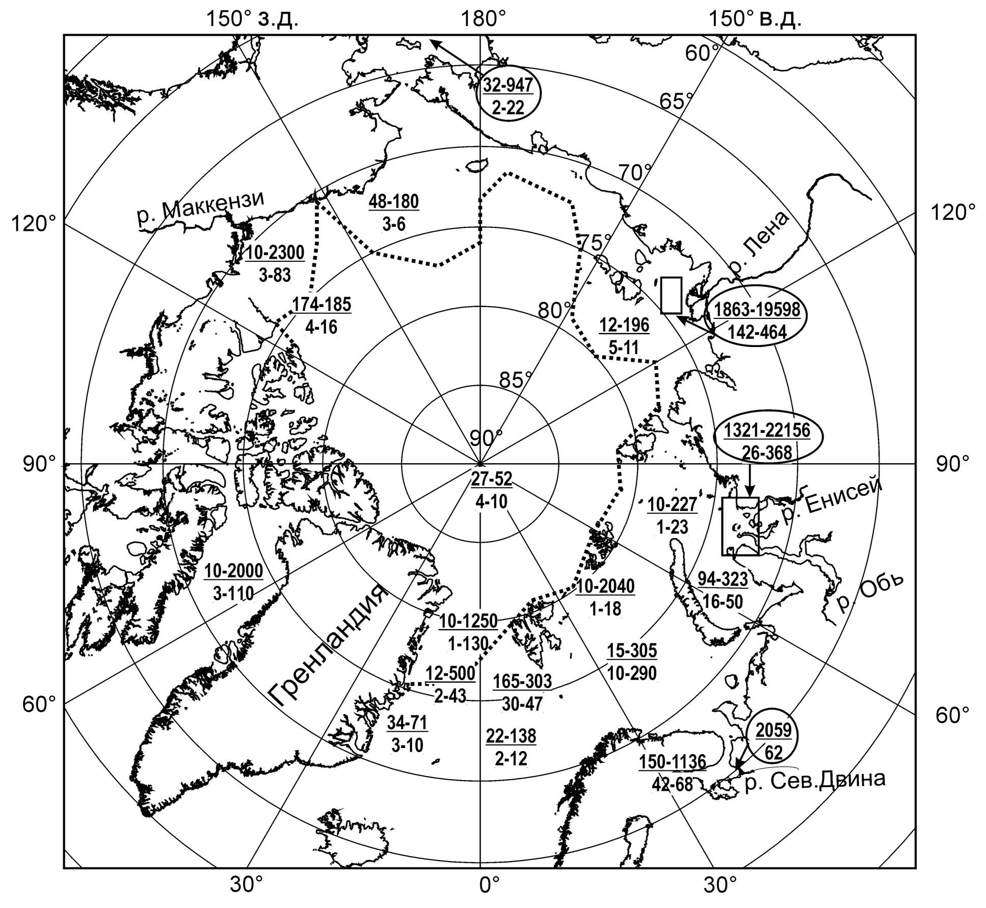 Рис. 1. Схема распределения величин вертикальных потоков осадочного вещества (общий поток в числителе мг/м2/сут и поток органического углерода в знаменателе мгС/м2/сут) в Арктике и Субарктике по нашим и литературным данным, полученным методом седиментационных ловушек [4].