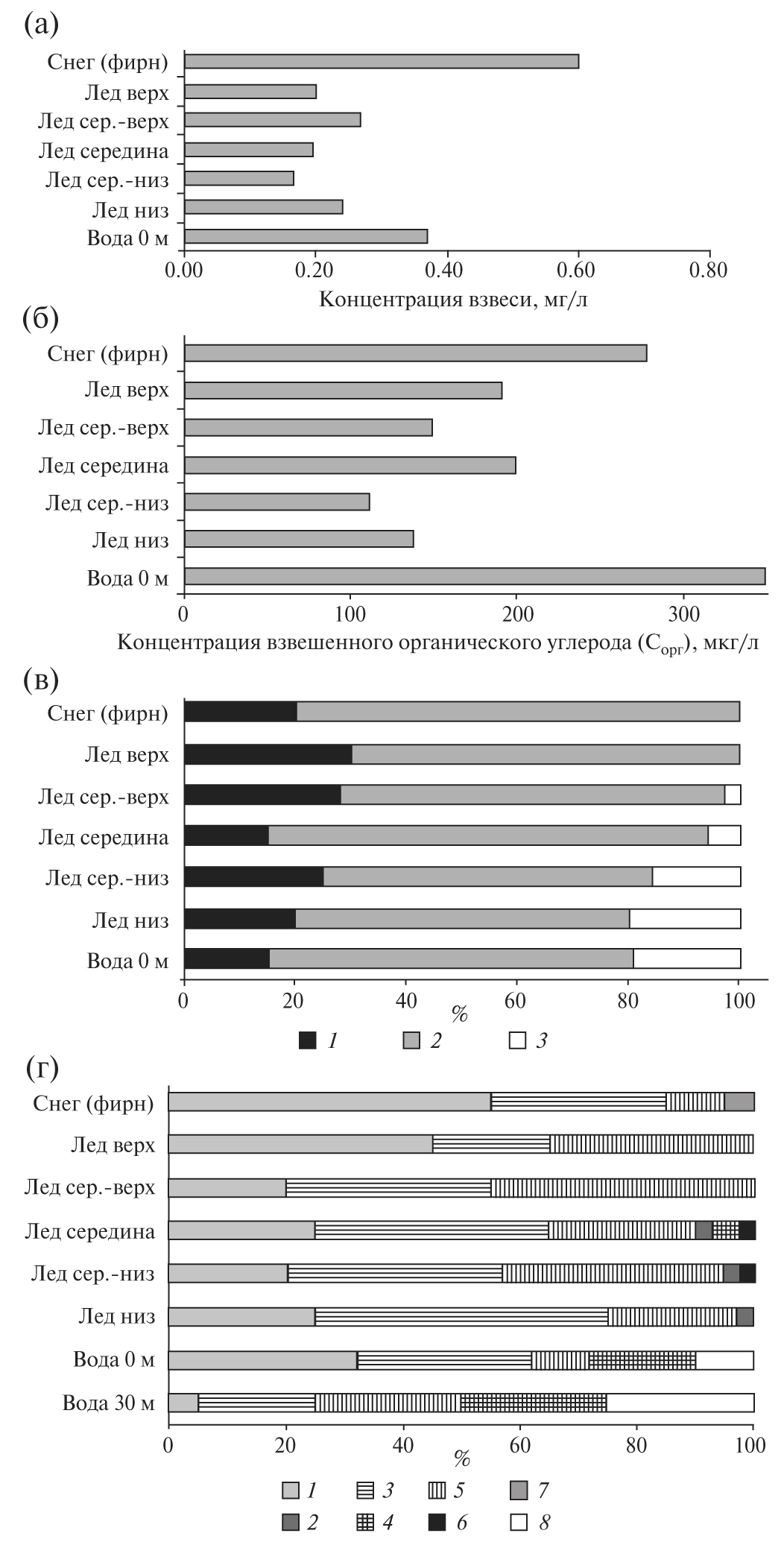Рис. 2. Распределение в околополюсной системе снег-лед-подледная вода: (а) — концентрации взвешенных частиц, мг/л; (б) — концентрации взвешенного органического углерода, мкг/л; (в) — процентного соотношения: 1 — литогенной составляющей, 2 — органического вещества, 3 — аморфного кремнезема (SiO2 аморф); (г) — процентного соотношения вещественного состава: 1 — литогенная составляющая, 2 — остатки высших растений, 3 — споры, 4 — биогенные остатки, 5 — диатомовые, 6 — пыльца, 7 — одноклеточные, 8 — бактерии [5].
