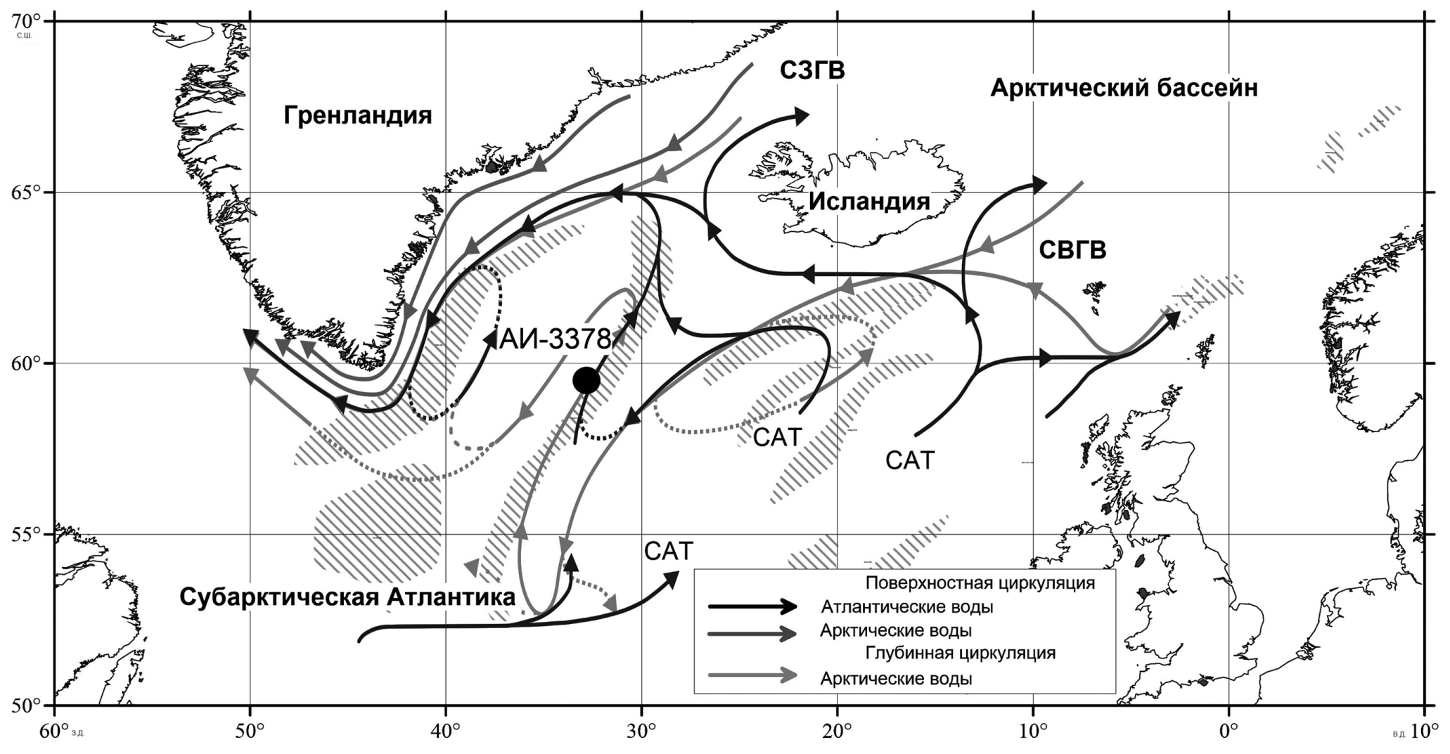 Контуритовые дрифты — это осадочные тела на дне морей и океанов, образованные в результате аккумуляции осадков под воздействием придонных (контурных) течений, движущихся преимущественно вдоль континентального склона [15, 18, 19]. Контуритовые дрифты были открыты около пятидесяти лет назад [12], и к настоящему времени их насчитывается около двухсот. Они представляют большой интерес для палеореконструкций океанологических процессов, в частности скорости и направлений устойчивых придонных течений [8, 19, 20]. Северная Атлантика — один из ключевых регионов Мирового океана, где осуществляется глобальная термохалинная циркуляция [4, 5], взаимосвязанная с изменениями климата. Активное проникновение относительно теплых и соленых атлантических вод в арктические моря во время межледниковых периодов и дегляциаций приводило к прогреванию поверхностного слоя воды, а также переносу тепла в высокие широты, что вызывало интенсификацию глобального океанского конвейера и таяние арктических льдов [4, 9, 12, 16; 17, 24]. Интенсивная адвекция североатлантического течения в высокие широты также обусловила резкое возрастание продуктивности вод [15].