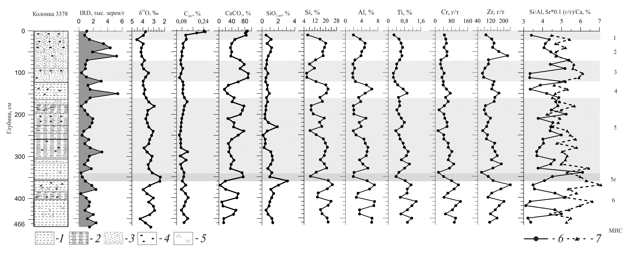 В стационарной лаборатории валовое содержание химических элементов в донных осадках (Al, Si, Са, Mg, К, Fe, Ti, Mn, Сr, Cu, Zn, Sr, Zr, Rb, Ba) определяли методом рентгено-флюоресцентного анализа (РФА) на приборе Спектроскан Макс-GVM (НПО СПЕКТРОН, г. Санкт-Петербург). Контроль правильности анализа осуществлялся с применением стандартных образцов СДО-1 (терригенные глины), СДО-3 (карбонатные осадки), NIST-2703 (морские осадки). Содержание Собщ и Сорг определяли кулонометрическим методом на анализаторе углерода АН 7529. Содержание CaCO3 определяли расчетом по концентрации Скарб с коэффициентом 8.3. Концентрацию аморфного кремнезема (SiO2am) определяли методом 5% содовой вытяжки с колориметрическим окончанием [3]. Для колонки АИ-3378 получены данные по соотношению стабильных изотопов кислорода (δ18 О) в раковинах планктонных фораминифер (вид Neogloboquadrina pachyderma (s), не менее 30 раковин в пробе, размер раковин ~150 мкм). Анализ был выполнен в лаборатории радиометрического датирования и изотопных исследований им. К. Лейбница Кильского университета на масс-спектрометре Finnigan MAT 251 доктором Н. Андерсеном. Точность метода составляет 0.08‰. Стратиграфическое подразделение колонки производилось с использованием изотопно-кислородных данных, данных по содержанию в осадках карбоната кальция и IRD, а также результатов измерений230Thизб. Выделено 6 морских изотопных стадий (МИС), охватывающих предположительно около 190 тыс. лет. Средняя скорость осадконакопления составляет 2.45 см/тыс. лет [7]. Довольно низкие скорости осадконакопления в районе склона дрифта Снорри соответствуют средним скоростям осадкообразования для открытой части Атлантики [1, 6].