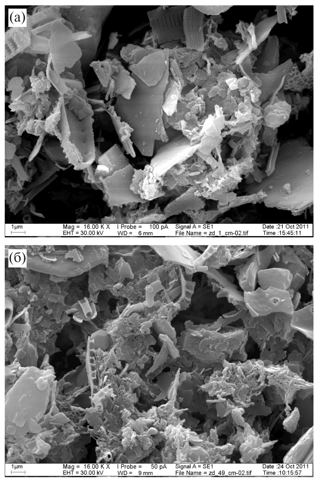 Рис. 1. Микроструктура образцов ила бухты Никольская Кандалакшского залива Белого моря: (а) — глубина 1 см; (б) — глубина 49 см.
