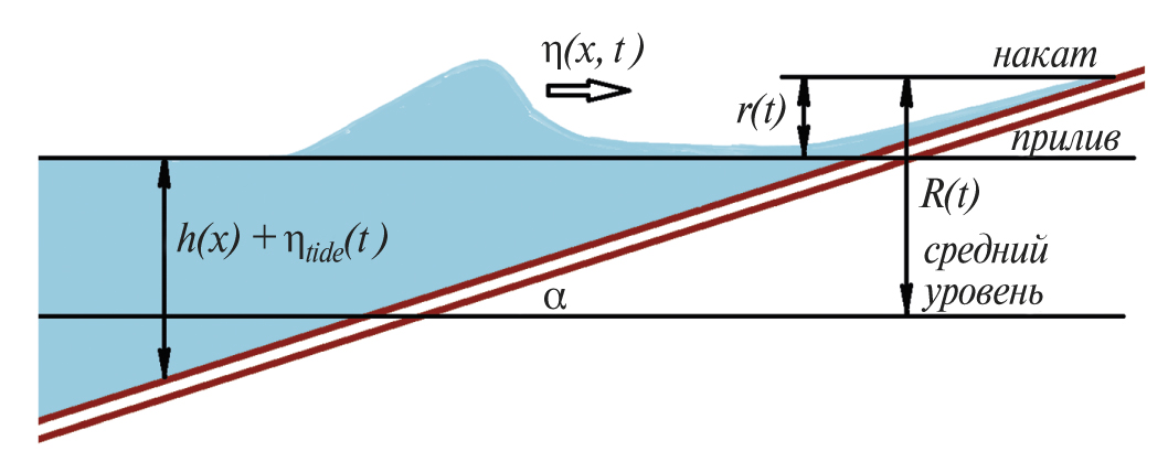 где η — смещение уровня моря, u — усредненная по глубине скорость водного потока, g — ускорение свободного падения и — переменная глубина бассейна, α — тангенс угла наклона берега к горизонту (рис. 1). Ось x направлена к берегу, и невозмущенный урез находится в точке х = 0. Граничным условием на берегу является равенство нулю полной глубины:
