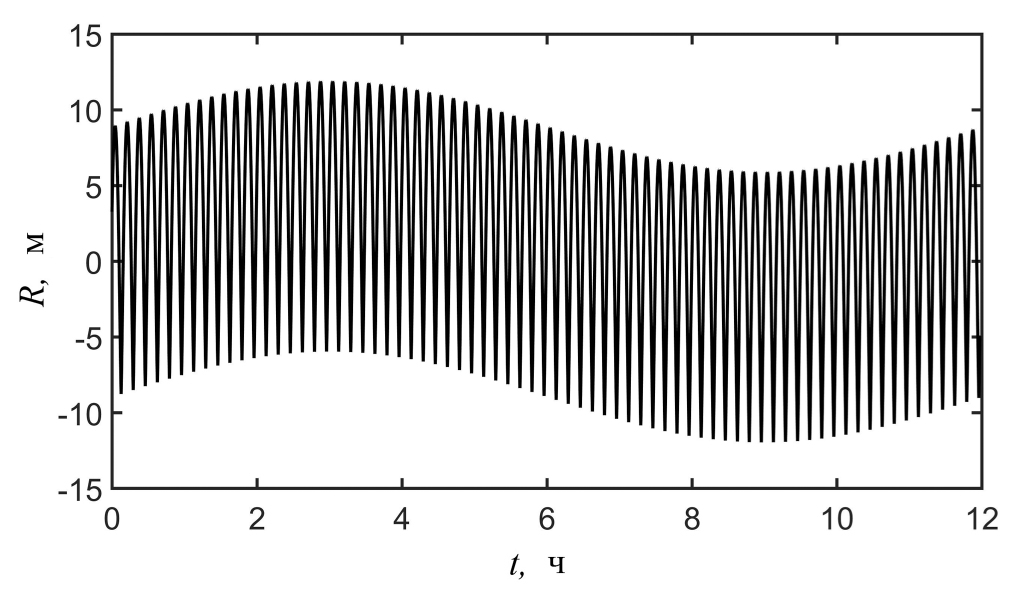 Рис. 2. Колебания волн с периодом 10 минут и амплитудой наката 8.9 м на берегу на фоне прилива с периодом 12 часов и амплитудой 3 м. Тангенс угла берегового склона α = 0.01. Сдвиг фаз φ = 0.