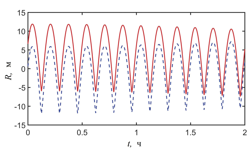 Рис. 3. Сравнение колебаний наката волн при максимальном приливе (сплошная линия) и отливе (штриховая линия) для условий рис. 2.
