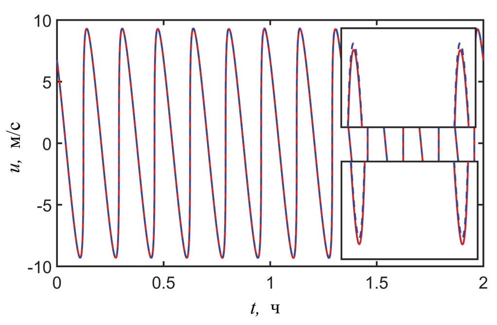 и φ представляет собой сдвиг фаз между ними. Здесь A0 и А — амплитудные характеристики прилива и цунами (высоты прилива и цунами рассчитываются по формуле (5)), Ω — частота прилива, ω — частота цунами, а J0 — функция Бесселя первого рода. В качестве примера взята волна цунами с периодом 10 минут и амплитудой наката 8.9 м на фоне прилива с периодом 12 часов и амплитудой 3 м. Тангенс угла берегового склона α равен 0.01. Параметр обрушения для этого случая, рассчитанный по формуле (10), равен Br = 0.99, что характеризует сильно нелинейные волны перед самым обрушением. Сдвиг фаз φ = 0. Из-за большой разницы в периодах прилив фактически представляет собой «статическое» смещение уровня воды в соответствующей фазе с очень малой скоростью течения, однако здесь мы не будем использовать это естественное физическое предположение.
