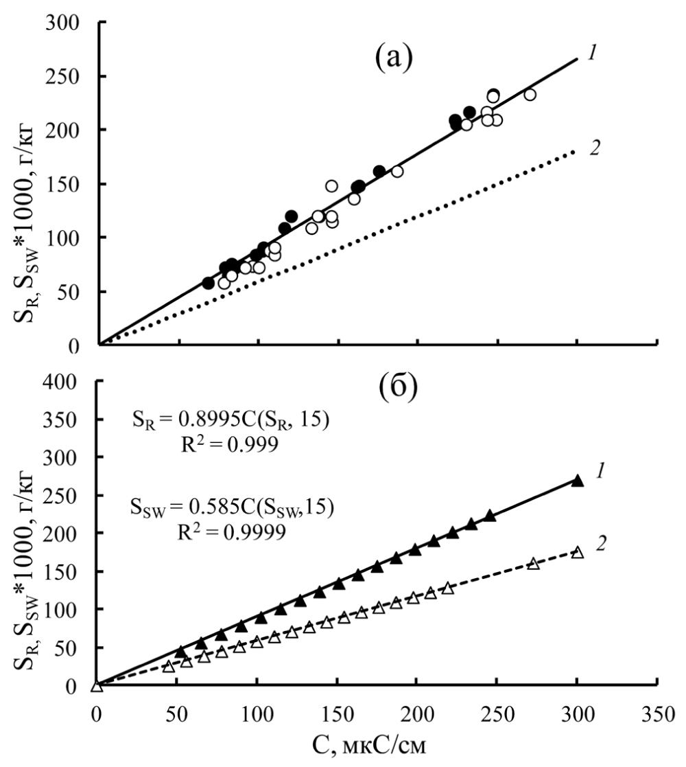 Рис. 2. Зависимость солености: (а) вод р. Раздольной (линия 1), SR, измеренной химическим методом, и морских вод, SSW, рассчитанной по океанографическому алгоритму (линия 2) от приведенной к 15°С удельной электропроводности; черные кружки — измерения электропроводности выполнены зондом, белые кружки — солемером; (б) линия 1 — SR, линия 2 — SSW, рассчитанные по модели [17].