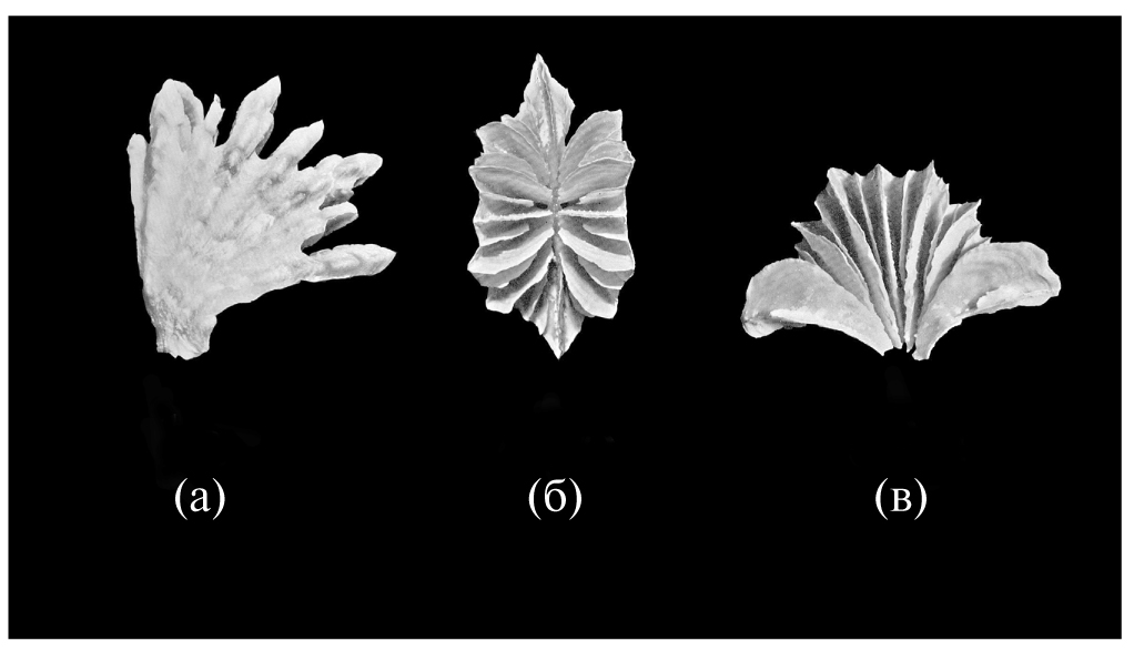 (а) — вид сбоку, (б) — вид сверху, (в) — вид в разрезе (хорошо видны септальные перегородки).