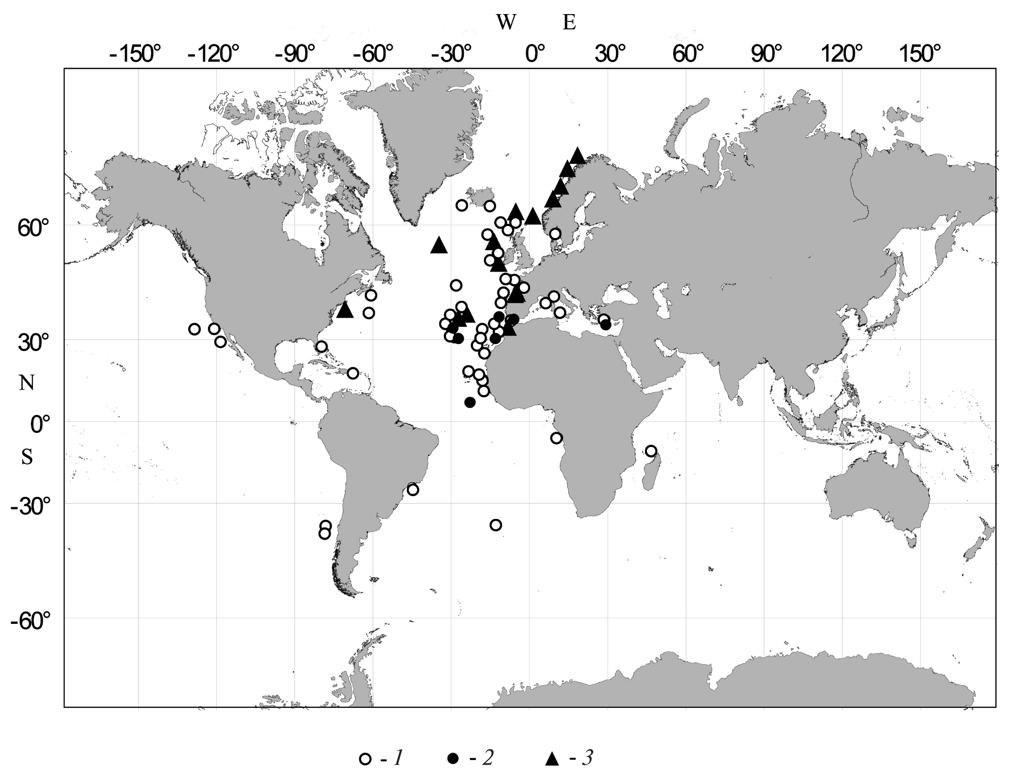 1 — Lophelia pertusa Linné, 1758 — по литературным источникам, 2 — Lophelia pertusa Linné, 1758 — по результатам экспедиций Интситута океанологии РАН, 3 — Flabellum macandrewi Grey, 1849 — только по литературным данным.