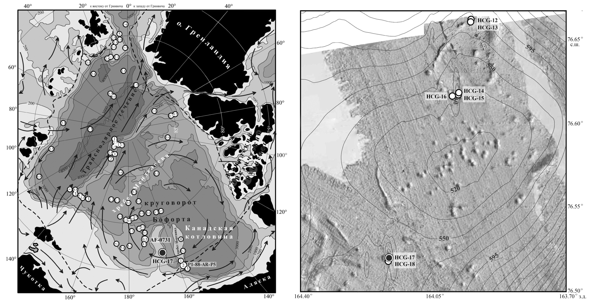 Отобранный на Чукотском плато материал (колонки HCG-12, -13, -14, -15, -16, -17, -18; рис. 1, справа) изучен фрагментарно и неравномерно. Прослежено распределение по разрезу цветовых (оптических) и петромагнитных характеристик, органических остатков, выявлены некоторые черты вещественного состава, проанализирован изотопный состав углерода и кислорода карбонатных пород и органического вещества осадков; построена модель флюидодинамики и развития донных воронок [1, 2, 12, 23, 25]. Почти все сведения касаются северного участка и в первую очередь колонки HCG-12. Юго-западный участок фактически не рассматривался.