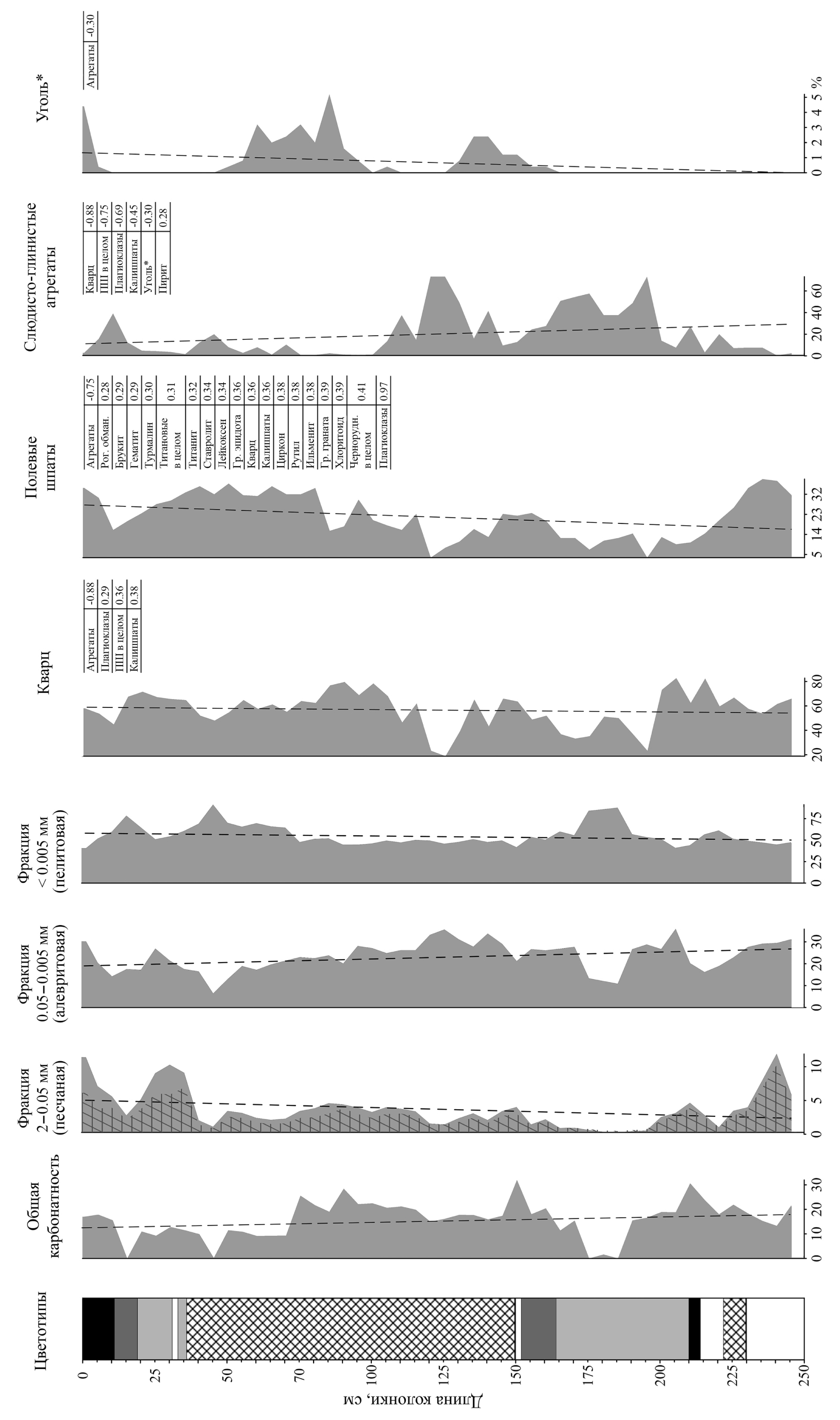 Среди породообразующих минералов особенно крепкими прямыми связями обладают кварц с калишпатами, полевые шпаты с плагиоклазами (то есть плагиоклазы являются преобладающими минералами в группе полевых шпатов), а также с чернорудными минералами в целом, хлоритоидом, гранатами, ильменитом, рутилом, цирконом (r ≥ 0.38, перечисление идет в порядке ослабления связи). При этом и у кварца, и у полевых шпатов имеется обратная зависимость от количества в осадках слюдисто-глинистых агрегатов (r = -0.88, -0.75 соответственно). У преобразованных растительных остатков и угля единственная значимая связь фиксируется также с агрегатами (сильная обратная, r = -0.75). Последние положительно коррелируют (0.28) только с пиритом. Из акцессориев самыми многочисленными и исключительно прямыми значимыми связями характеризуется группа чернорудных минералов: корреляция установлена со всеми представителями чернорудных минералов, а также с отдельными минералами титана и группой титановых минералов в целом, минералами группы эпидота, гранатами, ставролитом, цирконом, корундом — вообще с большинством встреченных в разрезе силикатов и алюмосиликатов. Распределение по профилю группы титановых минералов практически полностью контролируется входящими в ее состав титанитом и ильменитом. Помимо естественной сильноположительной корреляции с остальными членами группы, особо прочная связь отмечается с гранатами, цирконом, минералами группы эпидота, ставролитом, хлоритоидом (r ≥ 0.91). Высокая степень взаимозависимости (r ≥ 0.90) наблюдается между гранатами и ильменитом, цирконом, титанитом, титановыми минералами в целом, минералами группы эпидота, рутилом, лейкоксеном; статистически значимых обратных связей не зафиксировано. Пироксены, в составе которых главная роль принадлежит диопсид-авгиту, а второстепенная гиперстену (отражено в том числе в коэффициентах корреляции), наиболее тесно “взаимодействуют” с минералами группы эпидота, титанитом и вообще титановыми минералами, цирконом, группой граната, ильменитом, рутилом, турмалином (r ≥ 0.71), не демонстрируя при этом каких-либо статистически значимых обратных связей. Пирит, этот единственный представитель класса сульфидов в колонке, кроме слабой прямой связи со слюдисто-глинистыми агрегатами обладает весьма слабовыраженной обратной зависимостью от содержания калишпатов (r = -0.30).