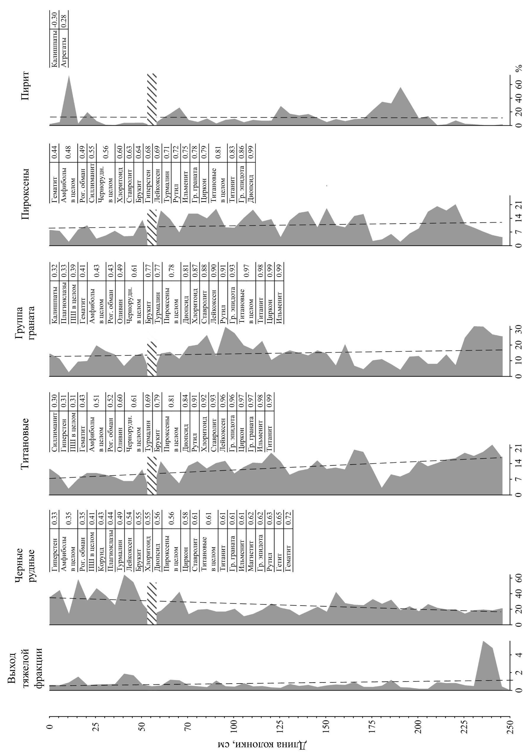 Тяжелая фракция (акцессорные минералы). Выход фракции низкий, в среднем 0.8%. Диапазон значений — от 0.2 до 5.5% (интервалы 198–208 и 233–238 см соответственно). По сравнению с легкой фракцией спектр минералов заметно шире. Всего в колонке выявлено 26 акцессориев, в пробах диагностируется от десяти до двадцати трех минеральных видов (табл. 2). Наибольшее разнообразие отмечено в интервалах 23–33 см и 103–108 см, наименьшее, включая абсолютный минимум, — на поддонной глубине 168–203 см. Среди акцессорных минералов доминируют чернорудные и титановые, или титанистые (основную массу составляют магнетит, титанит, ильменит), а также гранаты, эпидот, пироксены, пирит (табл. 2, рис. 3). Амфиболы и циркон встречаются практически повсеместно, но в подчиненном количестве. В некоторых пробах отмечаются корунд, силлиманит, турмалин, ставролит, апатит, хлоритоид, оливин, биотит. Редко и, как правило, в ничтожном количестве фиксируются карбонаты. Минеральные зерна в основном неизмененные либо слабоизмененные, средней степени окатанности. Распределение по колонке большинства акцессориев приближается к симметричному. Некоторые отклонения, наблюдаемые, в частности, у пирита и роговой обманки, объясняются присутствием значений, существенно превышающих медианное.