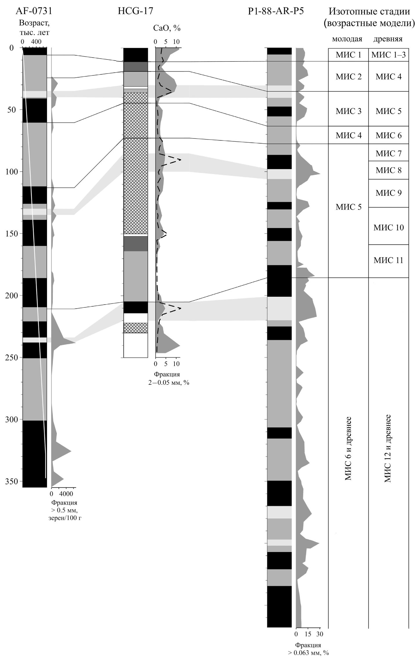 Литостратиграфия. В результате сопоставления с датированными колонками поднятий Менделеева и Нортвинд (морфоструктуры Чукотского бордерленда, смежные с Чукотским плато) [7, 44, 45] показано, что осадки колонки HCG-17 накапливались в четвертичное время в условиях циклической смены ледниковых и межледниковых режимов седиментации (рис. 4). Указать более точные временные границы не так просто ввиду того, что для определения относительного геологического возраста, расчленения и корреляции отложений Арктического бассейна используются две стратиграфические модели, так называемые древняя [42, 44, 45] и молодая [35, 36]. Первая предполагает наличие в нижней части осадочного разреза отложений, сформировавшихся на границе палеомагнитных эпох Матуяма и Брюнес, что соответствует МИС 19 (рубеж эоплейстоцена и неоплейстоцена; около 800 тыс. лет назад). В рамках древней модели предельный возраст колонки HCG-17 оценивается на уровне не менее МИС 12. Вторая, более употребительная модель (она подразумевает сравнительно высокую, порядка 1.5 см/тыс. лет, скорость седиментации и корреляцию нижних слоев осадочной толщи с МИС 7) в нашем случае дает значения, сопоставимые с МИС 6. Вообще стратиграфия осадков МИС 7 (МИС 19) и древнее, вплоть до начала четвертичного периода, изучена крайне плохо; вполне вероятно, что все это время господствовал слабоконтрастный климат [19].