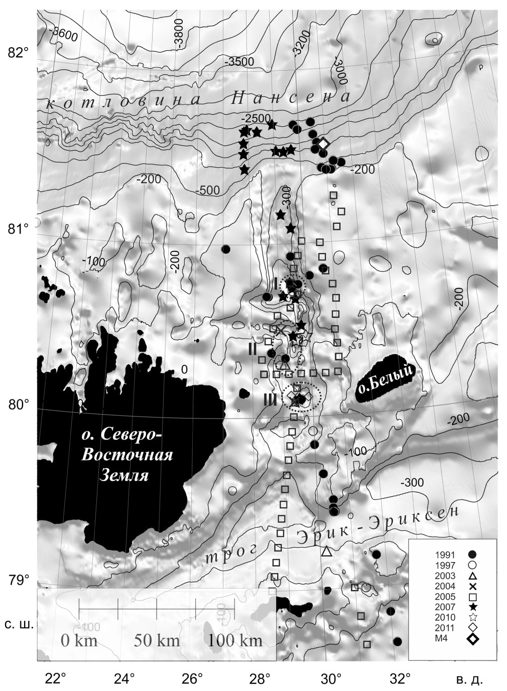 Согласно существующей циркуляционной схеме [5, 16], небольшие объемы АВМ ветви пролива Фрама в ходе ее вдольсклонового циклонического движения в котловине Нансена поступают в троги северной части Баренцево-Карского шельфа с севера, вдоль их западного борта и далее, частично рециркулируя, покидают троги вдоль восточного борта вместе с водными массами, поступающими с юга. Средняя глубина трогов соответствует глубине залегания ядра АВМ над континентальным склоном [5, 6, 12], следовательно, тепловое состояние АВМ является определяющим фактором в формировании термического режима придонного горизонта трогов северной части Баренцево-Карского региона и трога Орла в том числе.