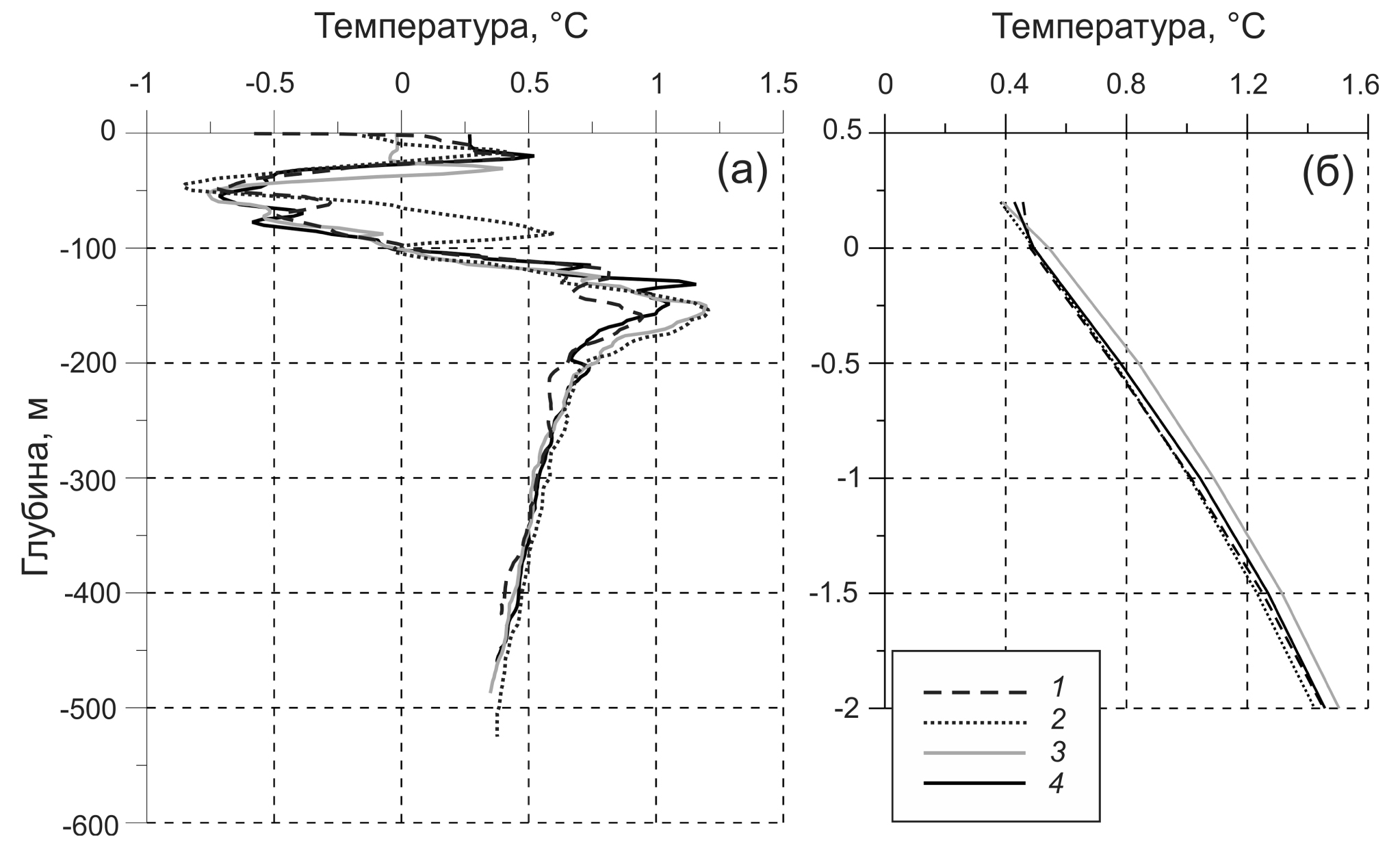При выполнении геотермических измерений в троге соблюдались условия наличия придонного изотермического горизонта (рис. 2а) и линейности градиента в осадках (рис. 2б). Однако имеющиеся гидрологические данные [6, 8, 10, 11] указывают на то, что район исследований располагается в зоне влияния атлантических водных масс (АВМ), обладающих значительной сезонной и межгодовой изменчивостью термохалинных характеристик [6, 9, 12].