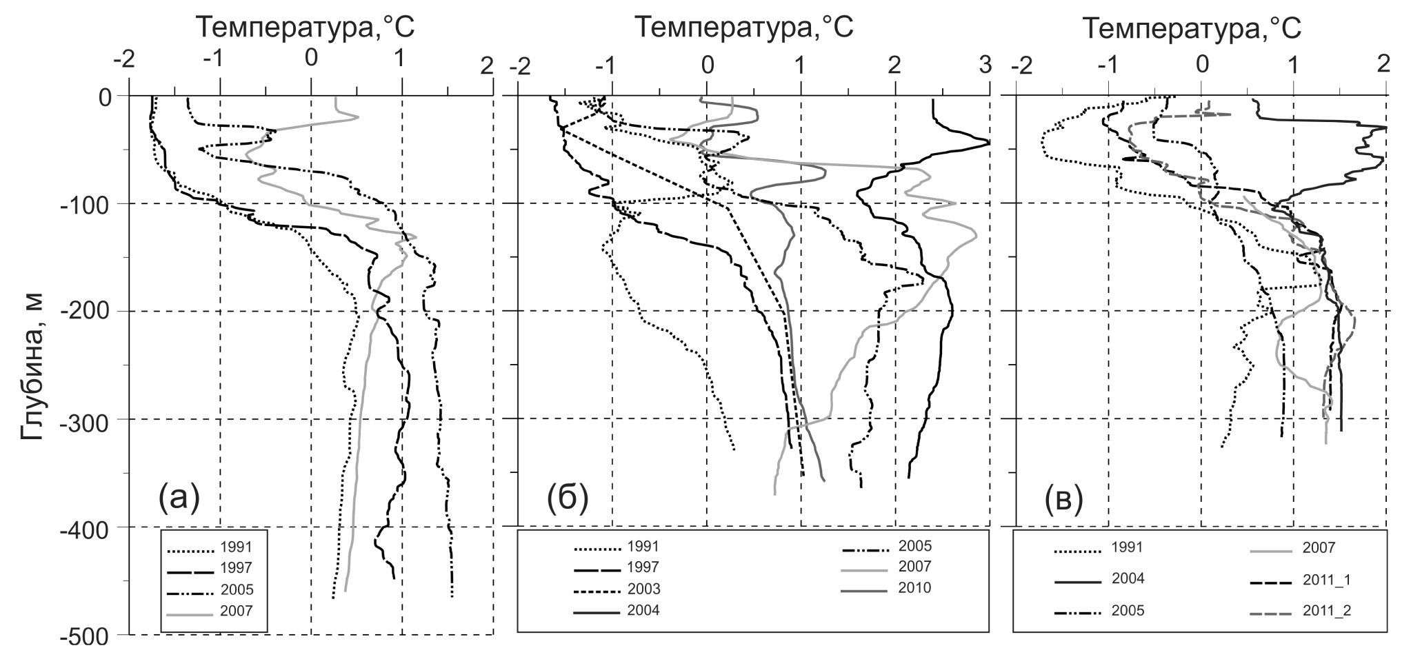Рис. 3. Распределение температур в водной толще для станций с близким географическим положением: (а) — в северной части (район I); (б) — центральной части (район II); (в) — южной части трога Орла (район III). Номера станций в районе I (а): 1991 — PS19_119; 1997 — PS44_55; 2005 — LA05/17_70; 2007 — STR25_31; в районе II (б): 1991 — PS19 _124; 1997 — PS44_54; 2003 — LA90/5_49; 2004 — 58JM_1000; 2005 — LA05/17_74; 2007 — STR25_35; 2010 — STR27_04; в районе III (в): 1991 — PS19_126; 2004 — 58JM_466; 2005 — LA05/17_70; 2007 — STR25_23, 2011_1 — 58HJ_371; 2011_2 — 58HJ_372. Районы I–III определены на рис. 1.