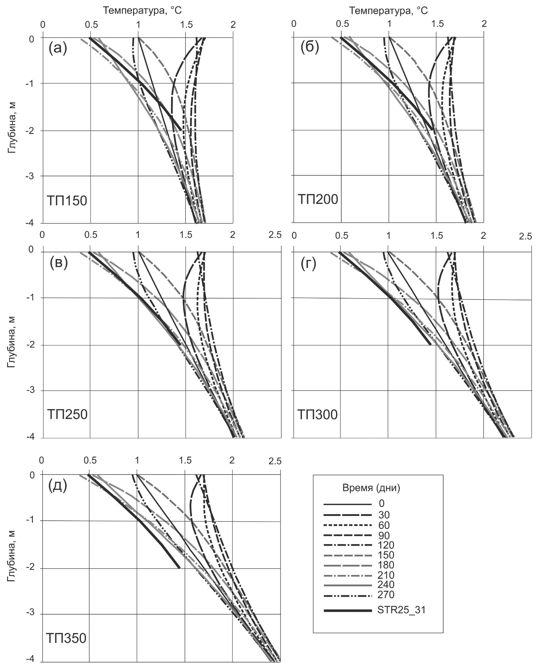 Следует отметить, что модельные температурные кривые практических сразу реагируют на повышение граничной температуры (распределение для 270 дней), поэтому расчеты представлены только до этого момента, поскольку модельные результаты, по понятным причинам, начинают удаляться от наблюдаемых в сторону нулевого положения и не представляют интерес.