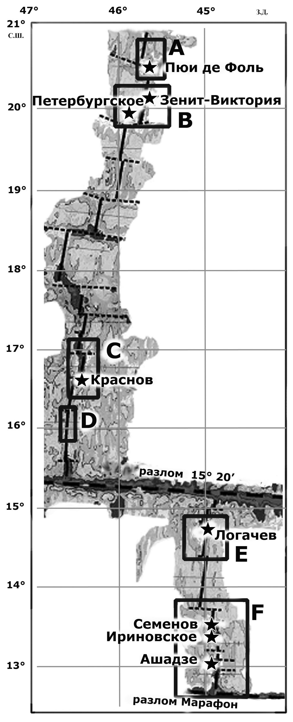 Экологические исследования Российского разведочного района (РРР) в центральной части северного Срединно-Атлантического хребта (САХ) [1] были проведены на 3-м этапе работ 39-го рейса НИС «Профессор Логачев» с 25 февраля по 15 марта 2018 г. Данные работы продолжали исследования, начатые авторами в 2015 г. в ходе 37-го рейса НИС «Профессор Логачев» [2]. Mатериалы по изучению исходного состояния экологической среды были собраны на трех участках РРР: E, F и G (рисунок). Основные методы изучения глубоководной биоты включали телепрофилирование (7 профилей), отбор проб донной фауны с использованием трала Сигсби (6 станций на глубинах 2260–3740 м), отбор проб ихтиофауны и ихтиопланктона с использованием разноглубинного трала Айзекса-Кидда в модификации Самышева-Асеева (РТАКСА) (29 станций, горизонты от 250–0 до 2500–0 м), а также проб фауны из геологических орудий (драги, телегрейфера и коробчатого пробоотборника). В результате первичной обработки донных проб и теленаблюдений предварительно отмечено не менее 100 видов донных животных. Полученные данные свидетельствуют об общей бедности жизни в изученном районе как в качественном, так и в количественном отношении. По результатам первичной обработки уловов, встречаемость донных беспозвоночных составила от 17 до 105 экз. на километр пути траления. В уловах по численности доминировали ракообразные (в основном раки-отшельники Parapagurus cf. nudus) и морские ежи, по крайней мере, четырех видов (Salenocidaris sp., Plesiodiadema sp., Echinocyamus sp. и Sperosoma sp.). На долю этих групп приходится 38.6% от общего числа полученных из тралов донных беспозвоночных. Также в больших количествах были встречены плеченогие, двустворчатые моллюски и одиночные склерактиниевые кораллы. Представители остальных групп беспозвоночных присутствовали в уловах в небольших количествах или единично. Наиболее глубоководные станции (3660–3740 м) отличались как характером осадка, так и небольшим количеством или отсутствием морских ежей и двустворчатых моллюсков, массово встречавшихся в траловых уловах на меньших глубинах (2260–2990 м). По данным телепрофилирования, дно на глубоководных участках траления было покрыто тонким илом, в котором практически отсутствовали птероподы и ракуша, характерные для более мелководных террас. Предварительный структурно-функциональный анализ позволяет охарактеризовать донное сообщество осадков исследуемого района как биоценоз мелких собирающих детритофагов, существующий в условиях ограниченной доступности пищевых ресурсов. В сообществе представлены также мелкие сестонофаги. Основной пищевой зоной бентоса являются самый верхний тонкий слой осадка и слой придонных вод. Каменистые фации заняты сообществом крупных сестонофагов, тяготеющих к массивным выступающим формам рельефа. Районы депрессий и рудных отложений характеризуются снижением плотности мегафауны.