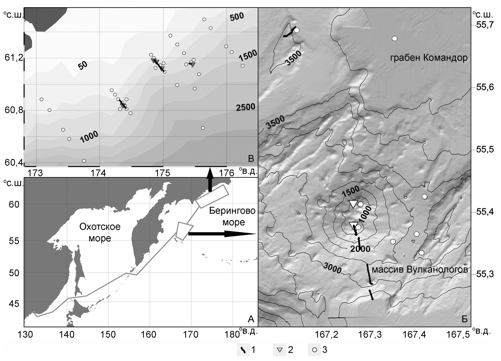 Рис. Карта маршрута экспедиции (А), погружений ТНПА «Команч» и станций отбора проб воды на полигоне 1 (Б) и на полигоне 2 (В); обозначения: 1 — треки погружений; 2 — станции отбора воды с помощью ТНПА; 3 — станции отбора воды с помощью комплекса батометрической кассеты и CTD-зонда.