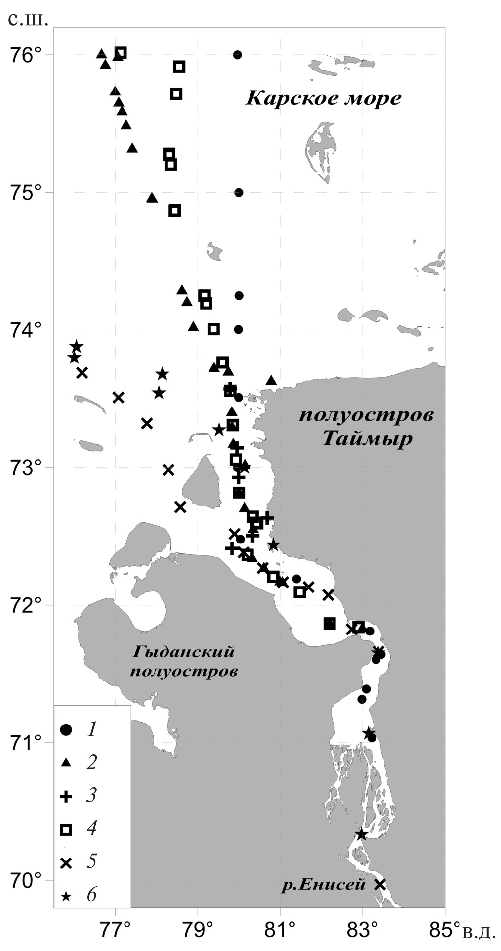 Рис. 1. Расположение станций в Енисейском заливе. 1 — НИС «Дмитрий Менделеев», 1993 г.; 2 — НИС «Академик Мстислав Келдыш», 2011 г.; 3 — НИС «Профессор Штокман», 2014 г.; 4 — НИС «Академик Мстислав Келдыш», 2016 г.; 5 — «Нор.Никель», 2016 г.; 6 — «Нор.Никель», 2018 г.