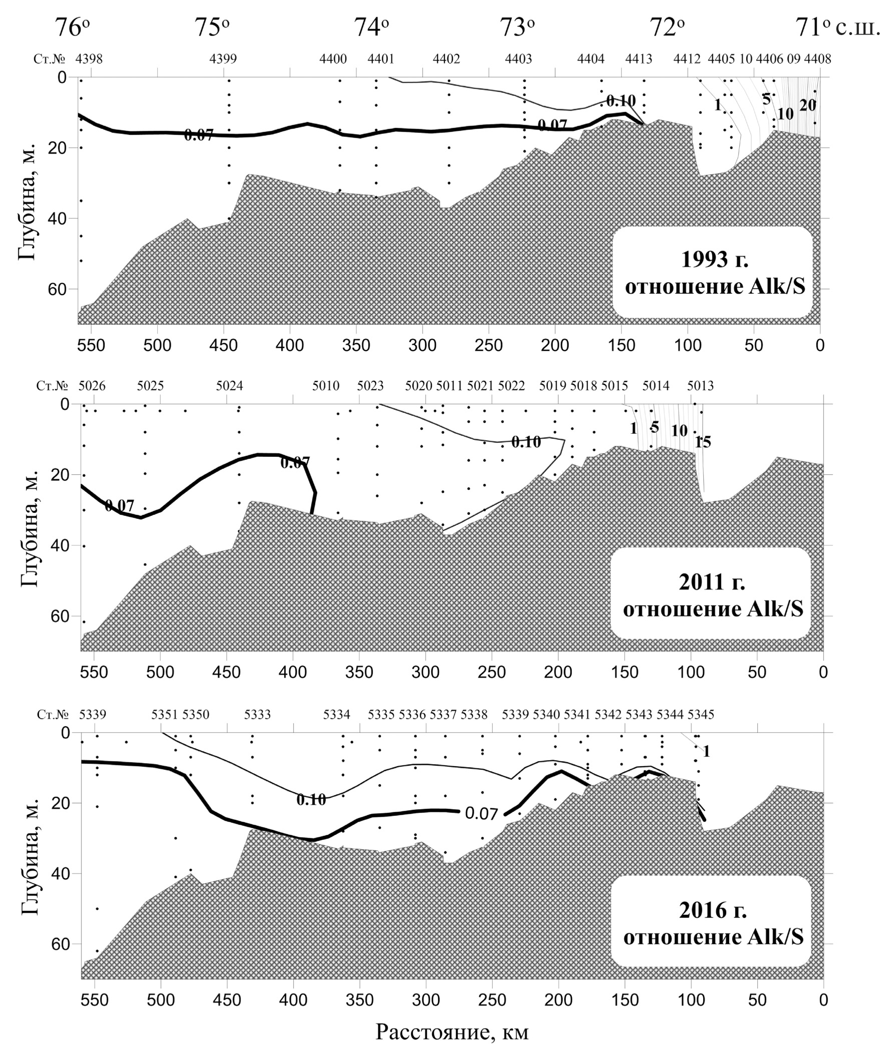 Одним из наиболее распространенных и надежных индикаторов присутствия речных вод признается величина отношения общей титруемой щелочности (Alk) к солености Alk/S (или к хлорности воды), так называемая удельная щелочность (УЩ). В речных водах, как правило, величина общей щелочности (Alk) будет ниже, но величина отношения Alk/S будет значительно выше, чем в морских водах. Следует отметить, что величина УЩ — более надежный критерий определения речного влияния на акваторию моря, чем соленость воды. Изменение солености может происходить и под влиянием таяния льдов (морских, речных, материковых), атмосферных осадков, деградации мерзлоты и прочего. Но значительное изменение соотношения Alk/S происходит только под влиянием речного стока. Считается, при УЩ более 0.06–0.08 можно уверенно говорить о значительном присутствии именно речных вод [13, 26]. На разрезах распределения величин Alk и УШ отчетливо видна зона смешения речных и морских вод (рис. 2). Как и у большинства крупных рек, она имеет сложное строение и состоит из 2 частей — вертикальной фронтальной зоны, расположенной в речной части, и горизонтальной, следы которой прослеживаются далеко в море, что хорошо видно по распределению солености и Ctot (рис. 3). В 2016 г. видна только часть горизонтального эстуарного фронта: до абсолютно речных вод, занимающих весь столб воды, дойти в этот год не удалось. Минимальная величина минерализации, отмеченная на разрезе в 2016 г., была 0.44 г/кг, что почти на порядок выше, чем в 1993 и 2011 гг. Но величина Alk и содержание растворенного кремния в 2016 г. в южной части разреза имели более «речные» значения. Величина Alk была почти вполовину меньше, чем в другие годы, а содержание кремния в полтора раза выше. Скорее всего, это связано с межгодовыми изменениями величины стока.