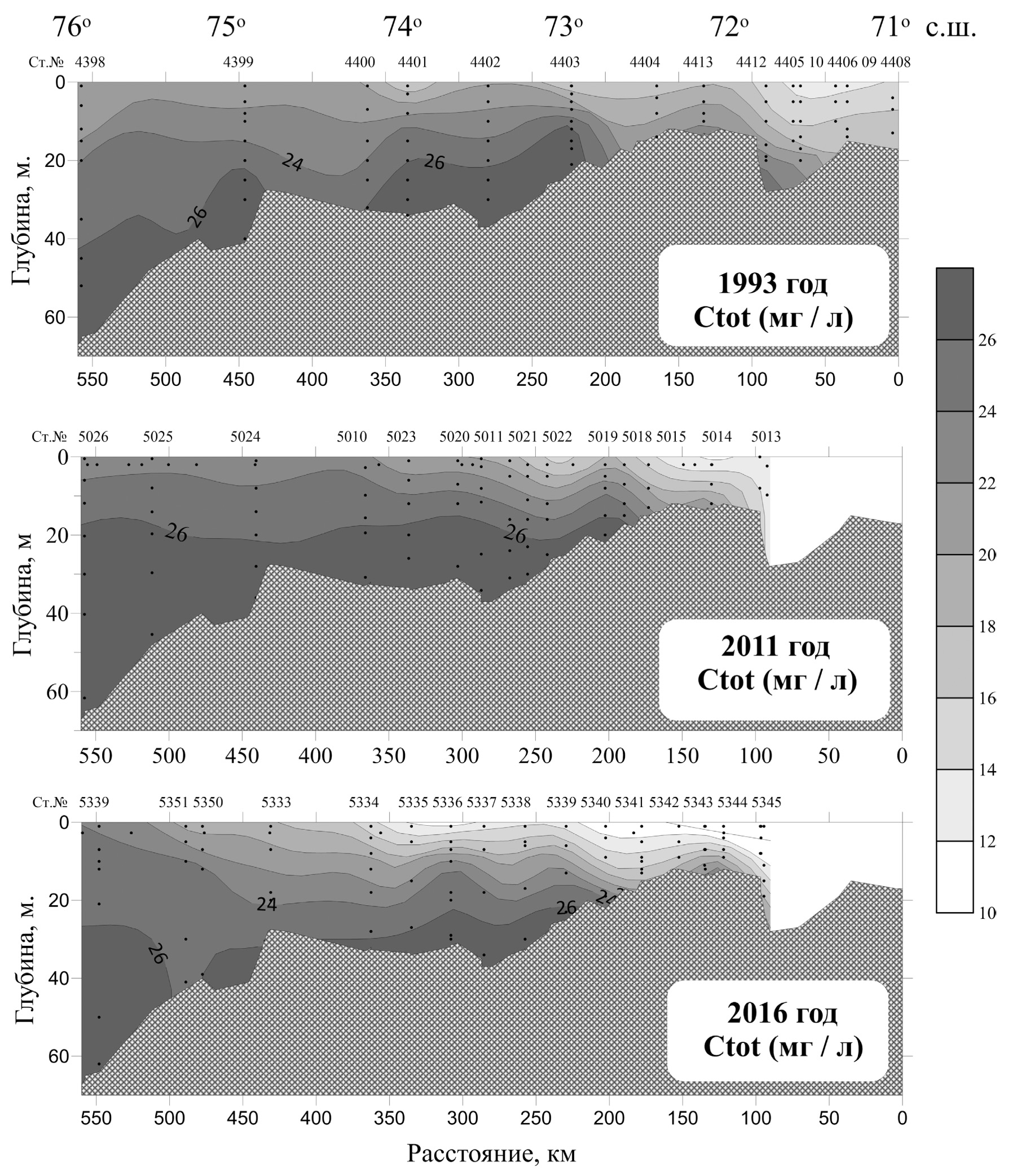 Распределение растворенного неорганического углерода и его динамика на разрезах в Енисейском заливе в 1993, 2011 и 2016 гг. значительно различались. Но основные черты распределения Ctot и других гидрохимических характеристик сохраняли общие закономерности. Во время всех съемок поверхностные воды всех разрезов были под ощутимым воздействием материкового стока. Как показывает величина УЩ, ощутимое влияние речного стока прослеживалось на расстоянии более 400 км от входа в залив. Но сильнее всего воздействие Енисея проявилось в 2011 г., когда сток реки был большим, чем в другие годы. Речные воды в этом году были обнаружены значительно севернее, чем в другие годы, и поверхностный слой со значительным присутствием речных вод был мощнее по всему разрезу. Распределение Ctot на всех разрезах было типичным для зон смешения, был близок и диапазон содержания Ctot. Но характер изменения содержания Ctot значительно менялся год от года.