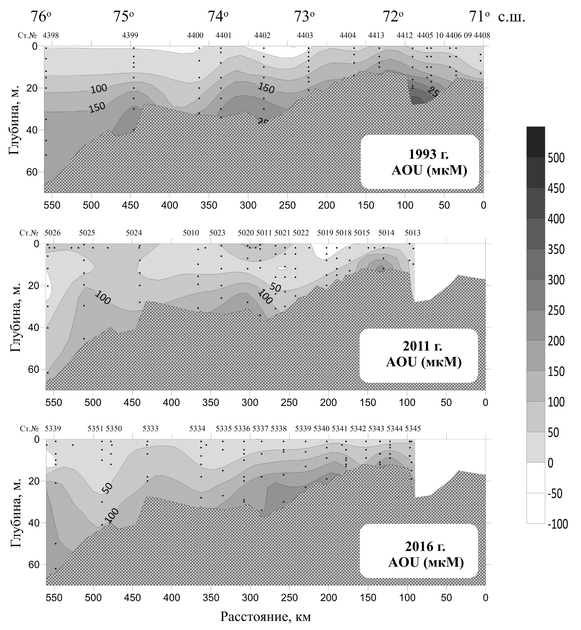 Увеличение содержания кислорода в 1993 г., возможно, проходило в узком поверхностном слое центральной и мористой части разреза. В 2011 и 2016 гг. области увеличения содержания кислорода отмечены фрагментарно в слое галоклина. В придонных водах кислород активно поглощается (до 340 µМ), особенно в отрицательных формах рельефа дна.