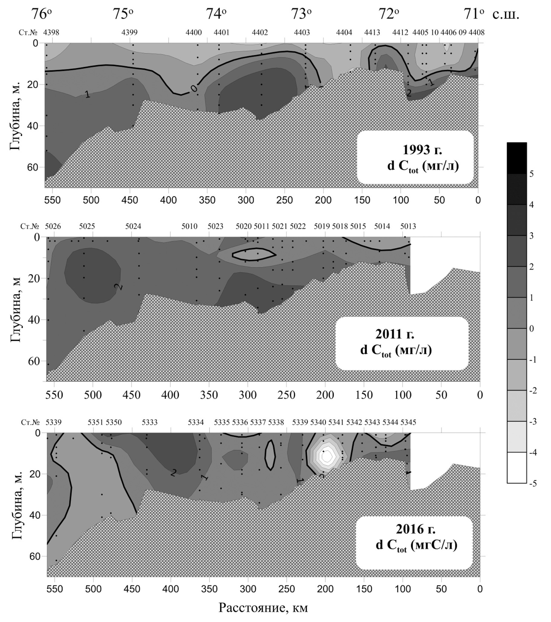 Напротив, в 2011 и 2016 гг. изменение содержания Ctot почти по всему разрезу было значительно выше, чем это могло быть обеспечено продукционно-деструкционными процессами. За исключением только поверхностных вод речной части разрезов, это свидетельствует, что поступление углерода в воду, скорее всего, связано с трансформацией минеральной взвеси и/или обменом углеродом придонной воды с донными осадками. Возможно, это может объяснить то, что в 2016 г. распределение величины Ctot значительно отличалось от других годов. В глубоких водах в большей части разреза наблюдалось уменьшение содержания Ctot (рис. 5). Предположить, что в этих водах активно проходили процессы фотосинтеза, сложно, и наиболее реально, что изменение связано с сорбцией углерода на взвеси. Возможно, играло роль и то, что экспедиция в 2016 г. выполнялась практически за волной половодья, и, естественно, вода содержала повышенное количество терригенной взвеси, чем в меженный период.