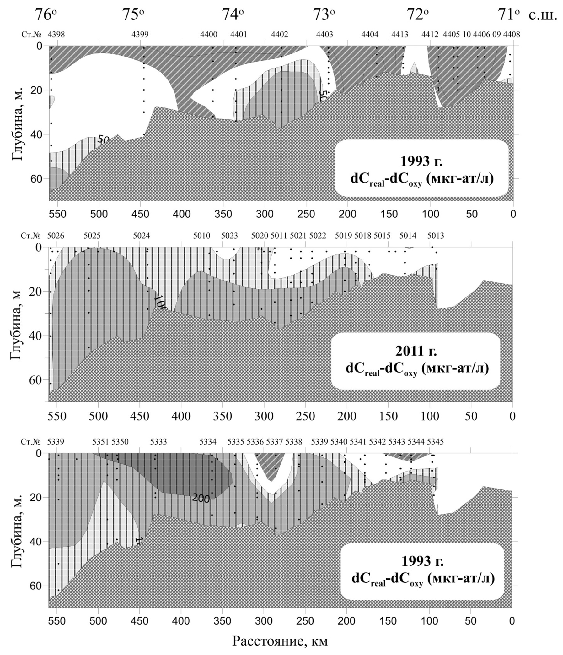 Распределение величины dCtot значительно различается по годам (рис. 5). В 1993 г. на поверхности всего разреза слой, где происходит поглощение Ctot из воды с наибольшей интенсивностью (до -6.7 мгС/л), — на контакте морских и речных вод. У дна выделение неорганического углерода в воду могло проходить в понижениях дна выше горла, между 73° и 74° с. ш., и на свале глубин в мористой части разреза. Интенсивность как поглощения, так и выделения углерода в воду была практически равной по разрезу. В 2011 г. уменьшение Ctot в воде наблюдалось фрагментарно в центральной и речной части разреза. В основной массе вод по разрезу шло выделение углерода в воду, хотя и с меньшей интенсивностью, чем в 1993 г. (максимальная величина dCtot была 3.6 мгС/л). В 2016 г. на большей части разреза величины dCtot были близкими к нулю. Значительное поглощение Ctot (dCtot до -4 мгС/л) отмечено ниже по течению от горла залива. Если сравнить распределение dCtot с величиной AOU, можно предположить, что в 1993 г. поглощение углерода водной биотой могло идти только в тонком слое в центральной и мористой частях разреза, где отрицательным значениям dCtot соответствуют положительные величины AOU. В 2011 г. убыль неорганического углерода почти всегда можно соотнести с фотосинтетической деятельностью водных организмов. В 2016 г. отчетливой связи величин dCtot и AOU не прослеживается.