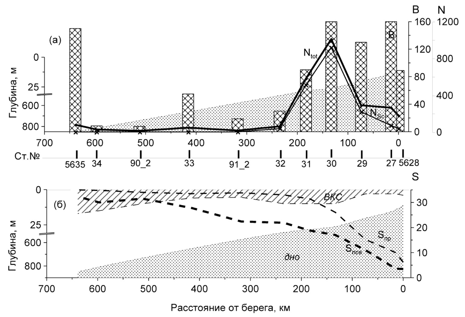 Фитоценоз биотопа континентального склона (ст. 5635, глубина 860 м) характеризовался более высокой, чем на шельфе, численностью водорослей — 80×10 3 кл./л. Биомасса фитопланктона достигала 150 мг/м 3 и была сравнима с той, которая наблюдалась в южной опресненной части Хатангского эстуария. Наиболее многочисленной группой были цисты динофлагеллят (46.2%). Биомассу определяли крупноразмерные виды фитопланктона, из которых 74.7% составляли диатомовые водоросли — в основном Detonula cf. pumila. Для вертикального распределения фитопланктона в области склона было характерно формирование глубинного максимума (рис. 9). Биомасса водорослей на глубине 45 м была в три раза выше, чем в верхнем перемешанном слое, — 400 и 120 мг/м 3 соответственно. Это определялось характером вертикального распределения морской крупноклеточной диатомеи D. cf. pumila со средним объемом клеток ~13 000 мкм 3. Судя по большому числу делящихся клеток в колониях этого вида на глубине 45 м, популяция находилась в состоянии активного роста. Возникновение глубинных максимумов возможно только при определенных условиях: высокая прозрачность воды и большая вертикальная протяженность эвфотического слоя, отсутствие жесткого пикноклина в эвфотическом слое, доступность биогенных элементов, поступающих из нижележащих слоев, на глубинах с освещенностью, достаточной для активного фотосинтеза. На ст. 5635 слабый пикноклин располагался между 16 и 20 метрами, мутность в слое над пикноклином была ~0.21 м-1, под пикноклином до 35 метров возрастала до ~0.35 м-1, и в нижележащих слоях снижалась до <0.1 м-1. Нижняя граница слоя фотосинтеза лежала на глубине 55 м. Уже на глубине 25 м концентрация нитратов возрастала до 4.5 мкг-ат/л (в верхнем перемешанном слое 0.17–0.21 мкг-ат/л), аммония — до 0.25 мкг-ат/л (в верхнем слое 0.01–0.06 мкг-ат/л), фосфатов — до 0.31 мкг-ат/л (в верхнем слое 0.05–0.07 мкг-ат/л), кремния — до 0.9 мкг-ат/л (в верхнем слое 0.1 мкг-ат/л).