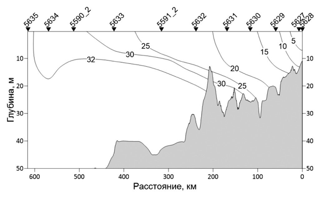 На границе между Хатангским заливом и прилежащим мелководным шельфом моря Лаптевых между станциями 5631 и 5632 на фоне увеличения солености с 18.8 до 21.8 psu зарегистрированы резкие изменения количественных показателей фитопланктона (рис. 2). Численность водорослей уменьшилась почти на порядок (с 580×10 3 до 60×10 3 кл./л), биомасса — в три раза (с 90 до 30 мг/м 3) (таблица). Столь значительные изменения суммарного обилия водорослей определялись сокращением более чем на порядок численности Skeletonema costatum. На фоне резких изменений численности фитопланктона снижение биомассы было менее существенным, что связано с появлением в фитоцене крупноклеточных морских видов динофлагеллят Dinophysis acuminatа и Ceratium arcticum и диатомеи Porosira glacialis.
