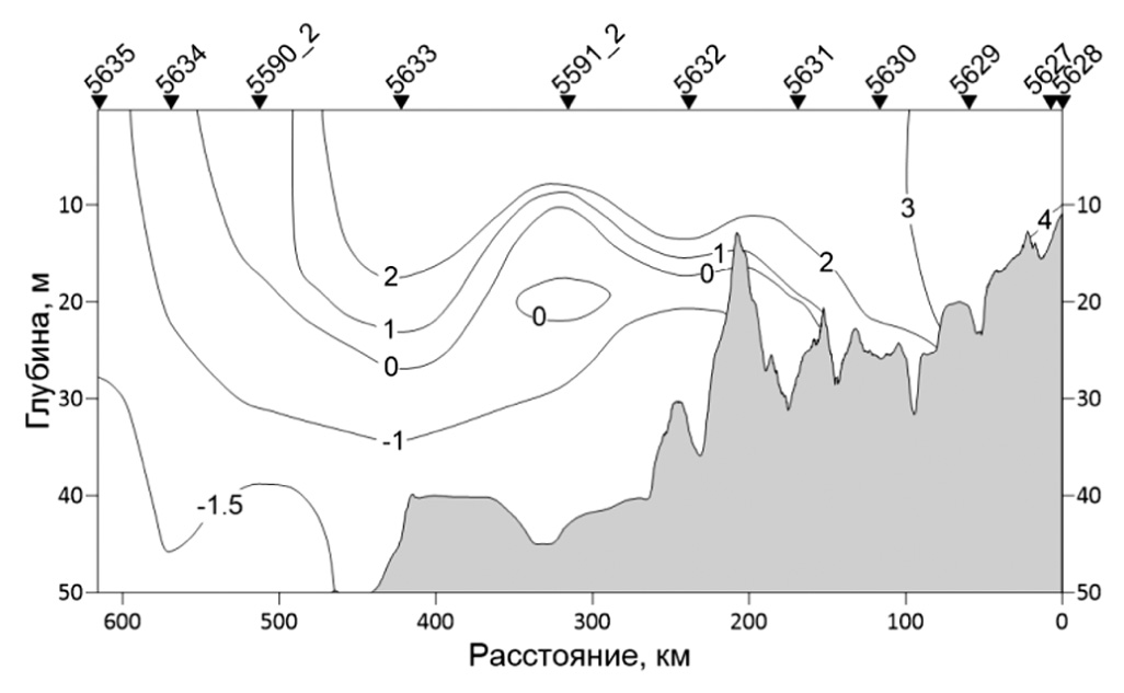 На шельфе моря Лаптевых мористее ст. 5632 и в области континентального склона при солености в поверхностном слое >22 psu были встречены только морские виды фитопланктона. Численность и биомасса на внутреннем и внешнем шельфе были самыми низкими на разрезе — <30×10 3 кл./л и <18 мг/м 3 (рис. 2, таблица). Исключение представляла ст. 5633 над глубиной 45 м, где в поверхностном слое наблюдалось пятно высокой численности Сhaetoceros compressus (~1.0×10 5 кл./л). Большое число спор в колониях С. compressus свидетельствовало о недавнем окончании периода «цветения» вида.