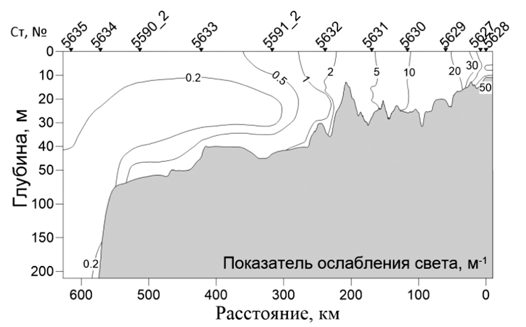 Рис. 5. Распределение показателя ослабления света на разрезе.