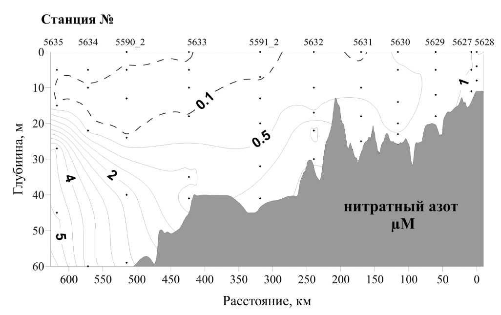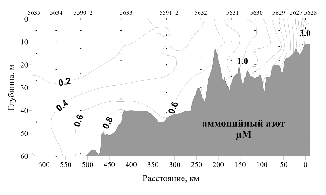Рис. 7. Распределение аммонийного азота на разрезе.
