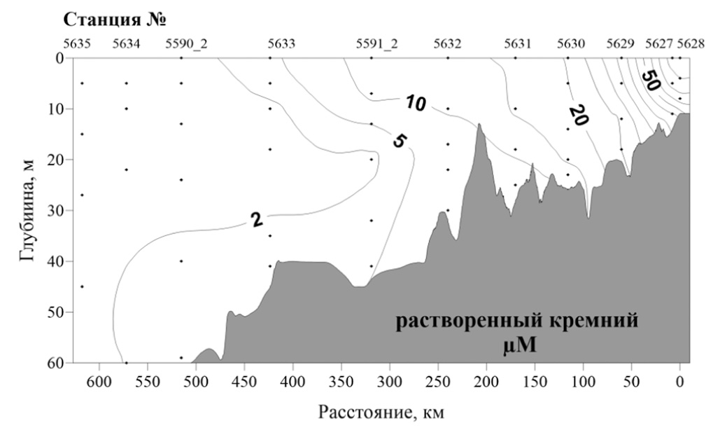 Рис. 8. Распределение растворенного кремния на разрезе.