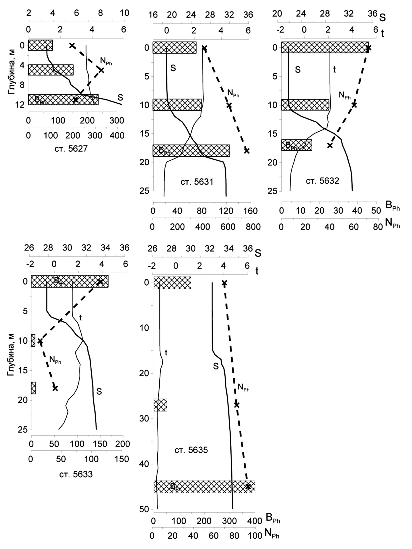 Рис. 9. Вертикальное распределение температуры (t), солености (S), численности (NPh) и биомассы (BPh) фитопланктона на станциях разреза.